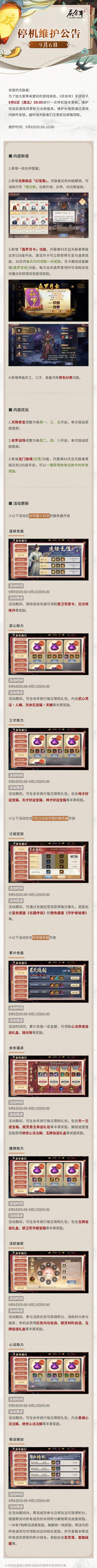 为了给大家带来更好的游戏体验,《庆余年》手游将于9月6日(周五)05:00进行一次停机版本更新,维护完成后游戏将更新为全新版本,维护补偿将通过游戏内邮件发放,届时请天脉者们注意前往邮箱领取。