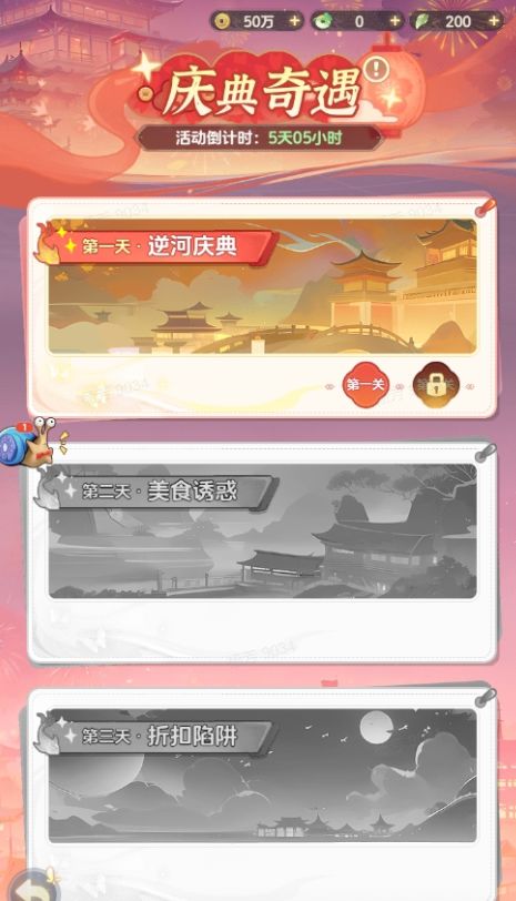 开服后第24天,游戏内等级达到15级,即可开启庆典奇遇活动。活动每天会开启一个章节关卡,挑战胜利可获得活动奖励。