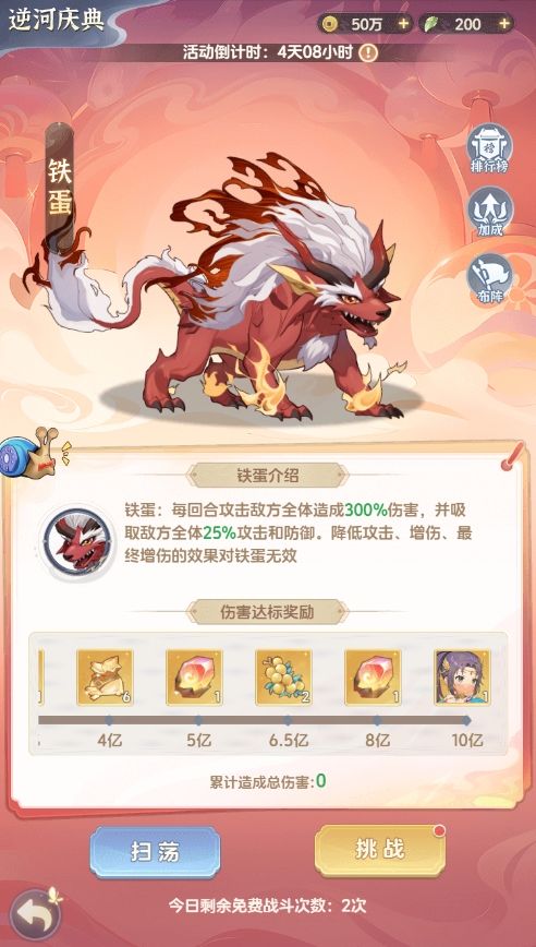 开服后第24天,游戏内等级达到15级即可开启王兽大作战活动,在活动期间,每日可参与王兽战斗,战斗造成的伤害会累计后进行排名,排名奖励在活动结束后发放。当期王兽大作战中,达到指定条件可激活伤害加成。伤害达标后可获得皮肤「陈曼瑶·敦煌」、天品药材等奖励。伤害目标奖励为一次性奖励,活动期间完成后不会重置奖励。