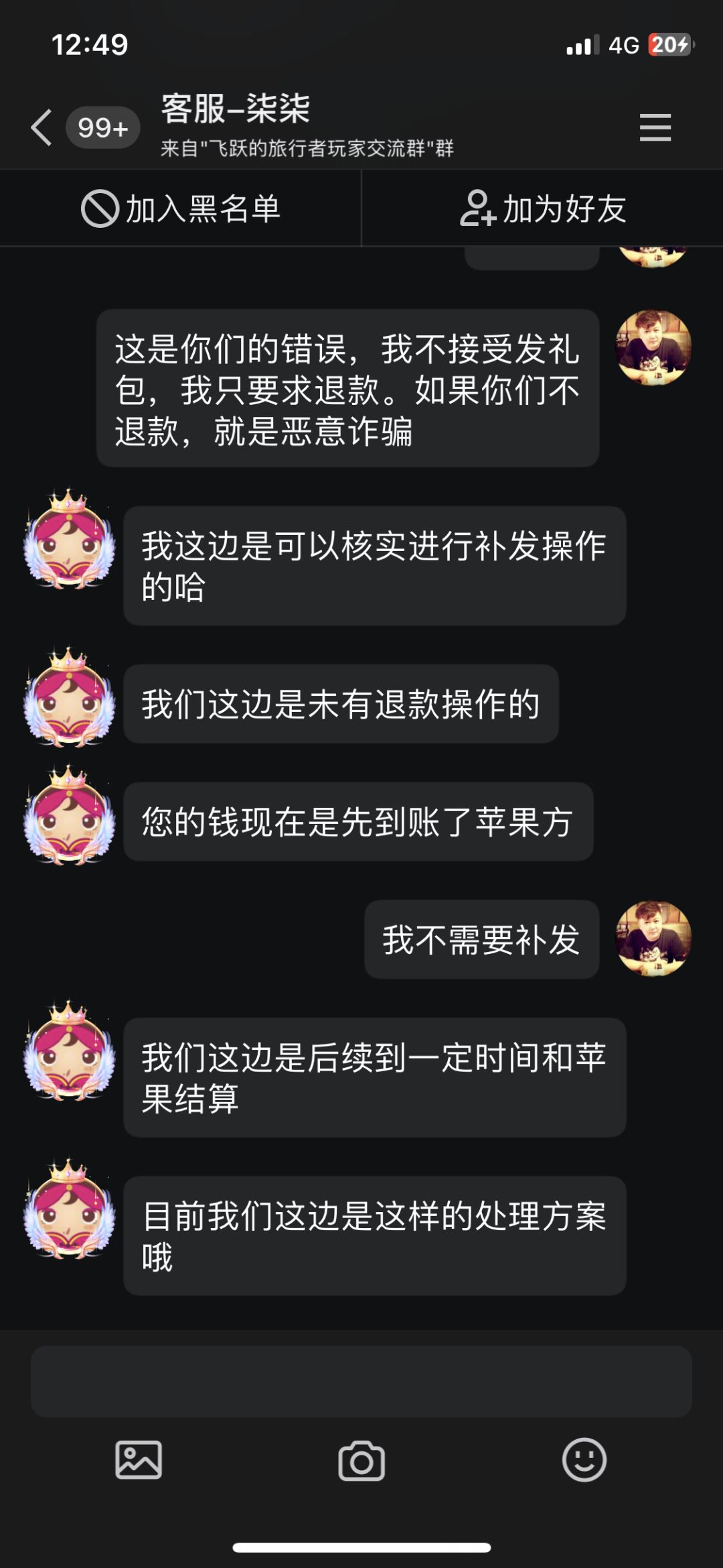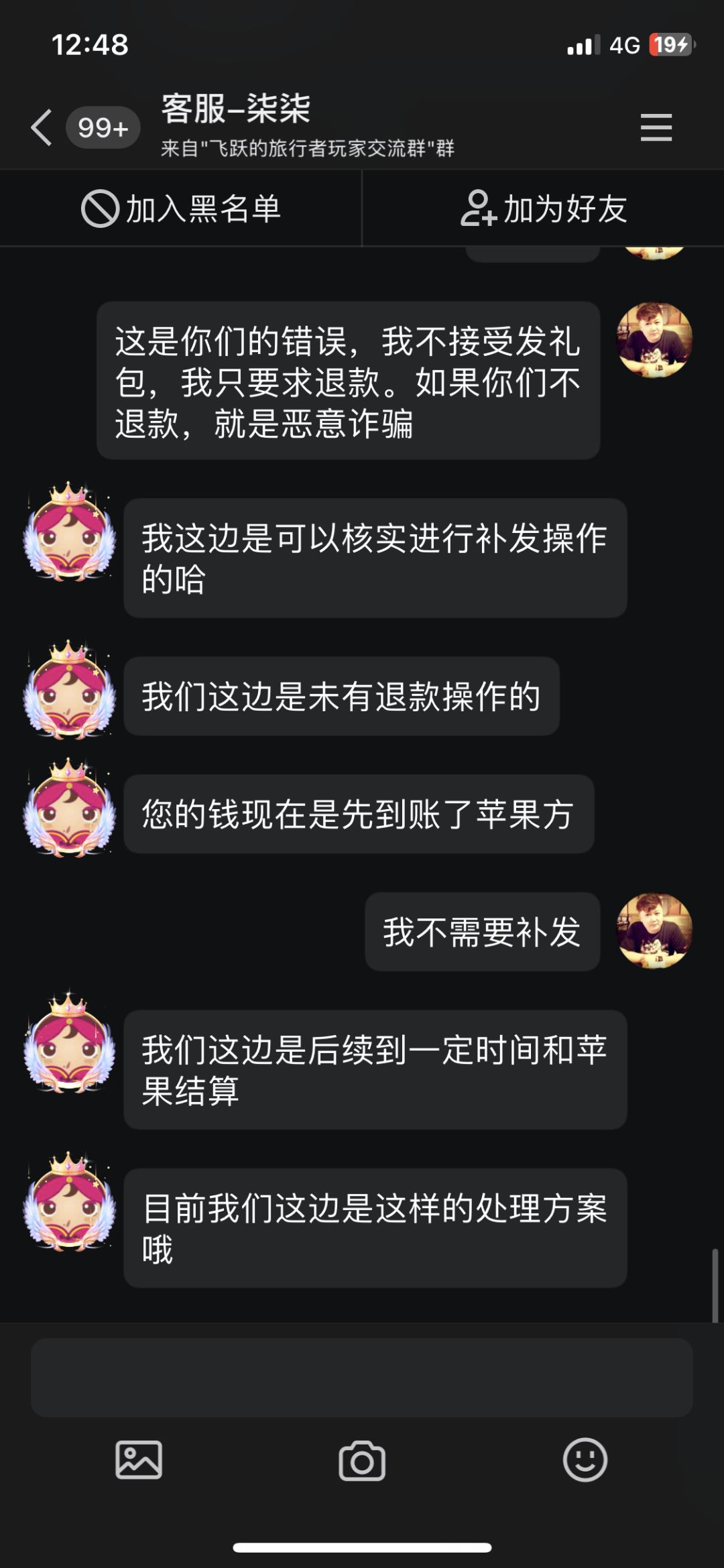 各位可以看一下,这个游戏充值金额自己定,你充的钱和扣款不一致,一个莫名其妙的礼包收三次钱,联系客服拒不退款,客服删聊天资料,禁言用户。态度强硬,这不算他们出Bug,就是恶意诈骗。这游戏就是个垃圾