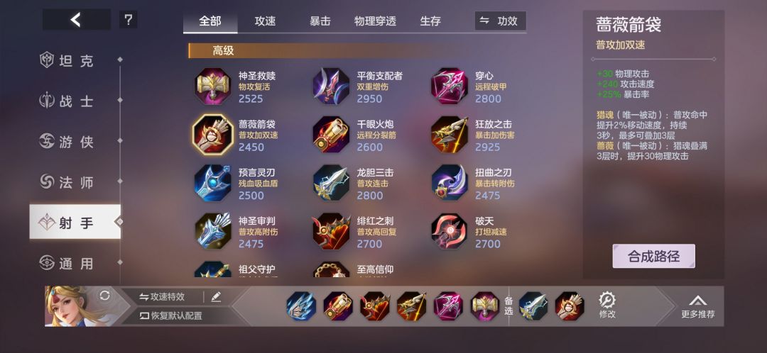 蔷薇箭袋:物理攻击、攻击速度、暴击率、移动速度BUFF——增伤以及机动性