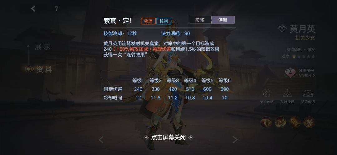 黄月英向指定方向释放机关套索,首个命中的单位将会受到伤害和被禁锢。释放完毕后黄月英会立即获得一次被动的强化普攻,需要注意的是会立即覆盖掉已经积攒的被动层数。如果已经积攒三层乃至满层被动时,建议打出强化普攻后再释放技能使得伤害最大化。二技能是黄月英的核心保命技能之一,非必要情况不要轻易释放!