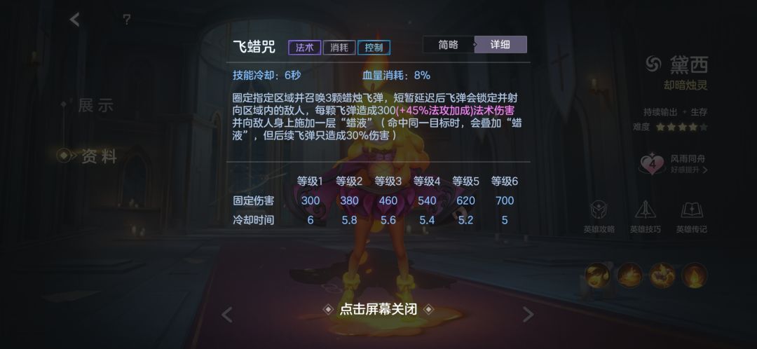 黛西向指定区域召唤三枚飞蜡,飞蜡会自动追踪范围内的敌人。受到伤害的敌人都会被标记一层印记,同一单位受到的伤害降低。需要注意的是一技能只有范围内有一个单位时才会对目标进行重复打击,目标周围有小兵、野怪、队友时都会将飞蜡进行分散。一技能释放时注意把握范围内的目标数量,尽可能的打出更多伤害。