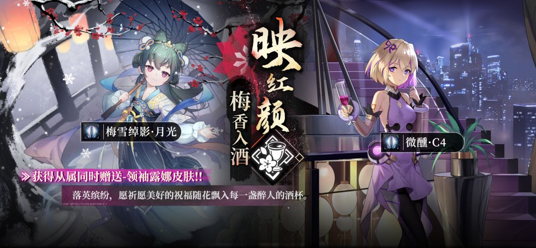 1、活动卡池「梅香入酒映红颜」限时免费开启。活动期间,Ω级从属「梅雪」,Ω级从属「微醺·C4」投影成功概率限时提升。另外,当投影首次获得「梅雪」时,将额外赠送领袖「露娜」的写真-「梅雪绰影」,更多详情可参阅活动卡池的规则详情。