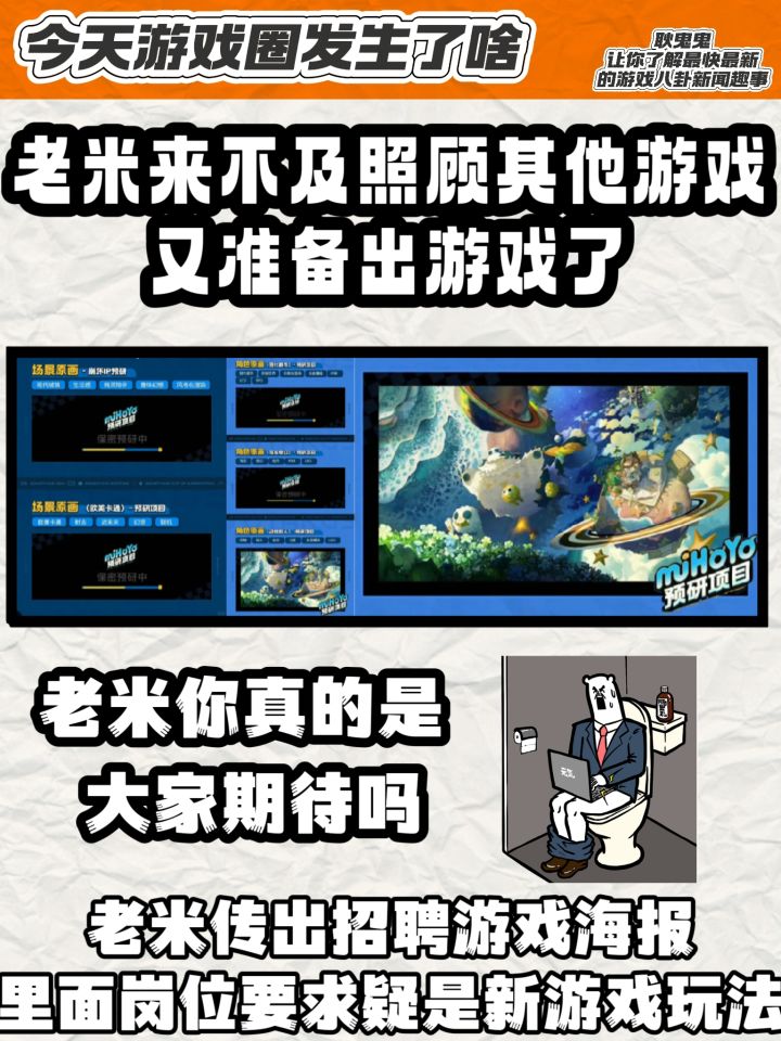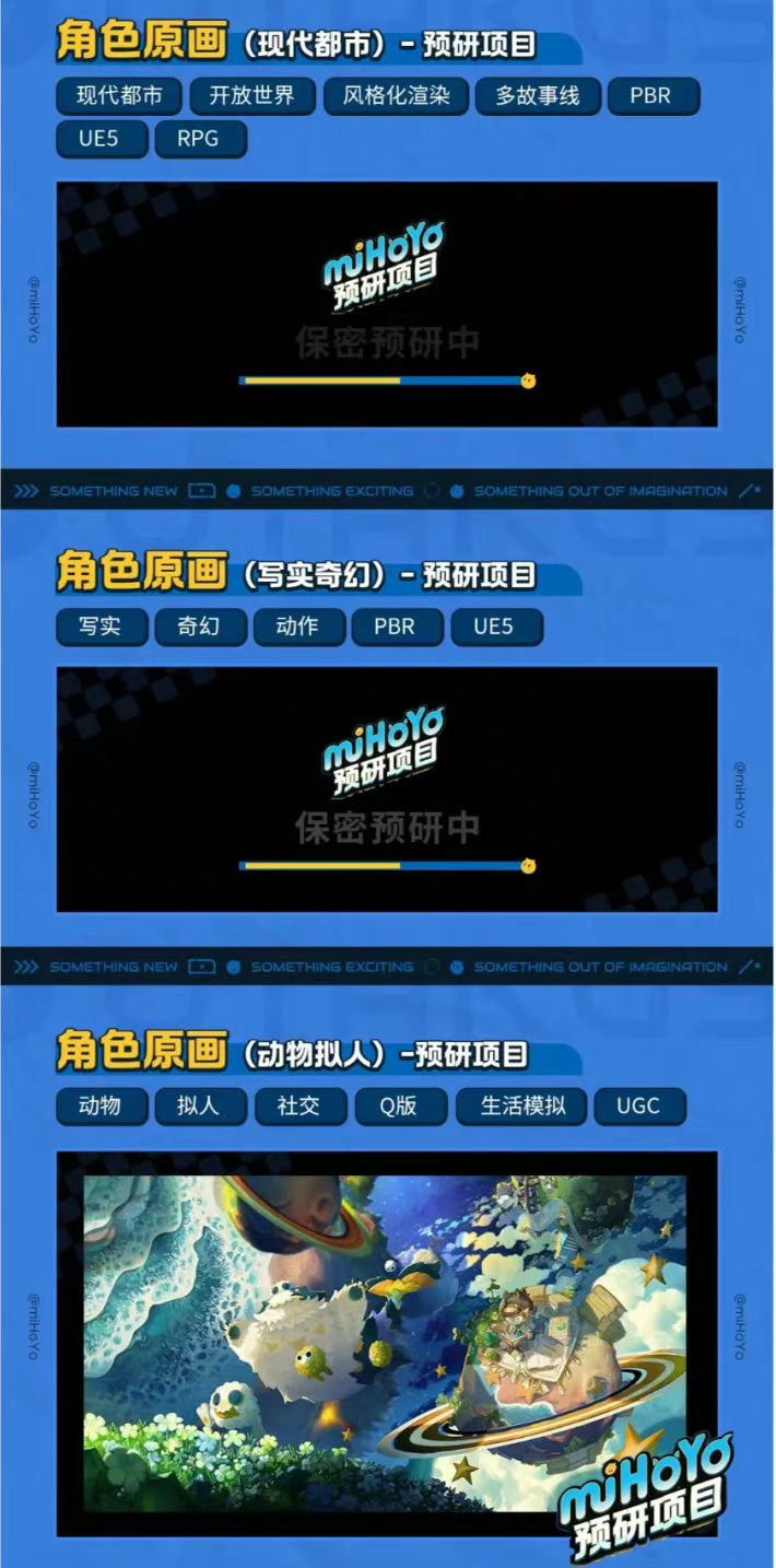 最近几张米哈游招聘海报的细节在流传,海报里面显示,目前几个预研项目在招聘各类原画。甚至公开的项目标签包含了现代都市/写实奇幻/动物模拟/欧美卡通,而动物拟人的角色原画招聘下,还标注了生活模拟、社交、Q版等。 老米你真的是,很期待你的新游哦,希望能给大家带来不一样惊喜吧。