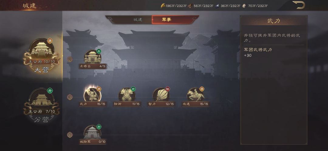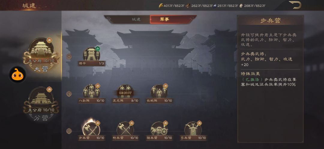 第二个影响因素以及数值分析:主城军事设施——领兵(在达到满级时提升4000带兵量)——连携/蜀/魏/吴/群(满级效果:两名同阵营武将属性加成8%三名属性加成10%同事增加10%的战斗经验加成)——阵法八卦阵/混元阵/长蛇阵(满级效果:分别提升主动伤害减免20%/连击伤害减免20%/战斗前30秒伤害增加10%)——步兵营/枪兵营/骑兵营/弓兵营(满级效果:同类兵总的武将可提升武力、防御、智力、攻速+20点!相当于2个武将红度!!同时提升要塞/主城的同兵种武将10%的增兵速度!)