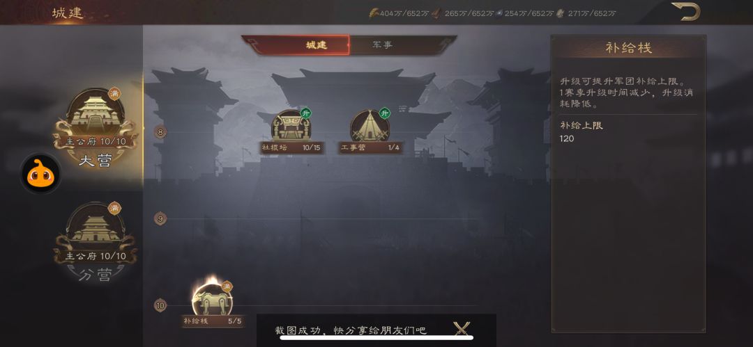 解决方案③在城建中找到补给栈,升至满级可以达到120的补给上线(配合带补给技能的主将可以打出高额团伤)