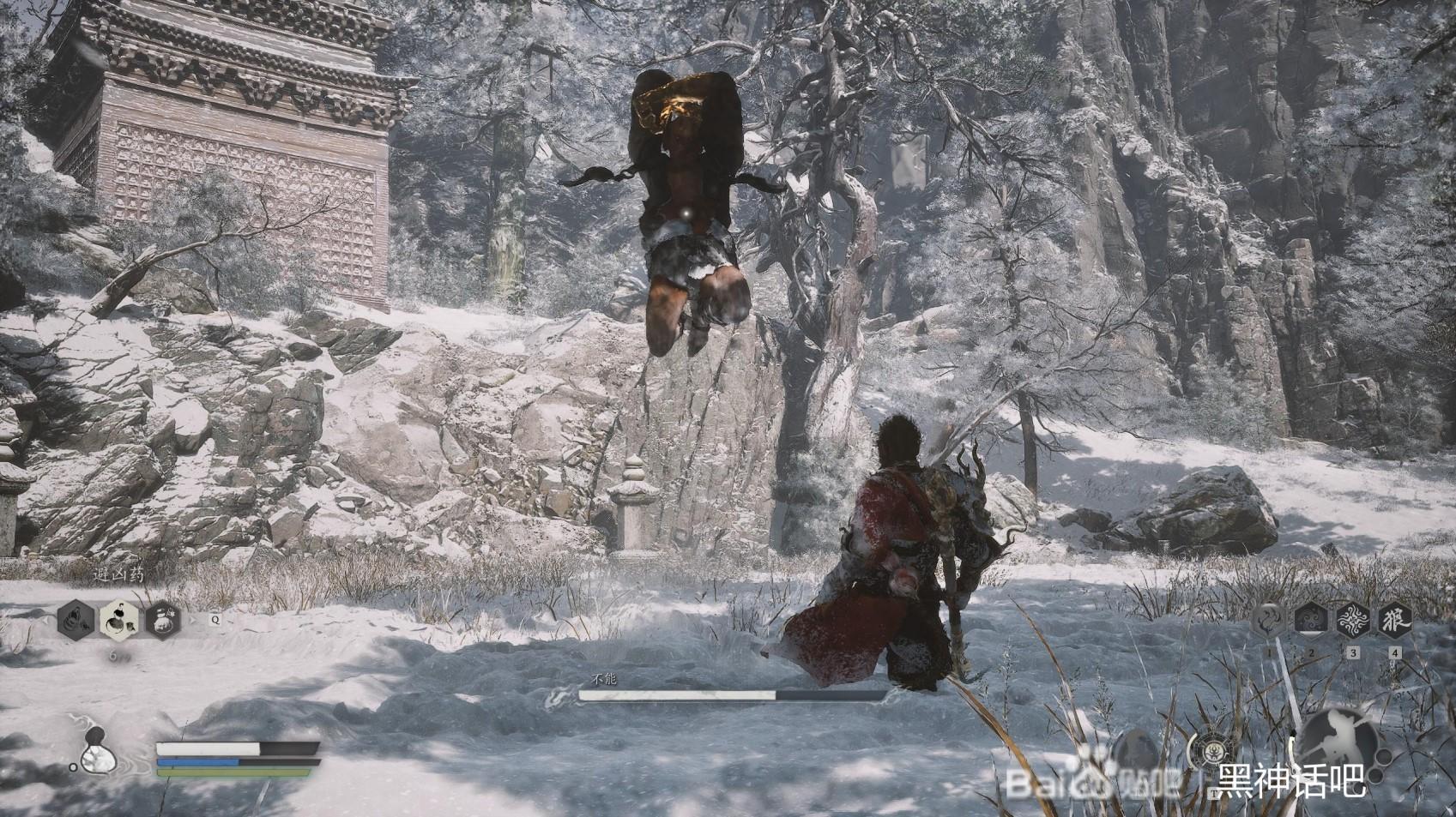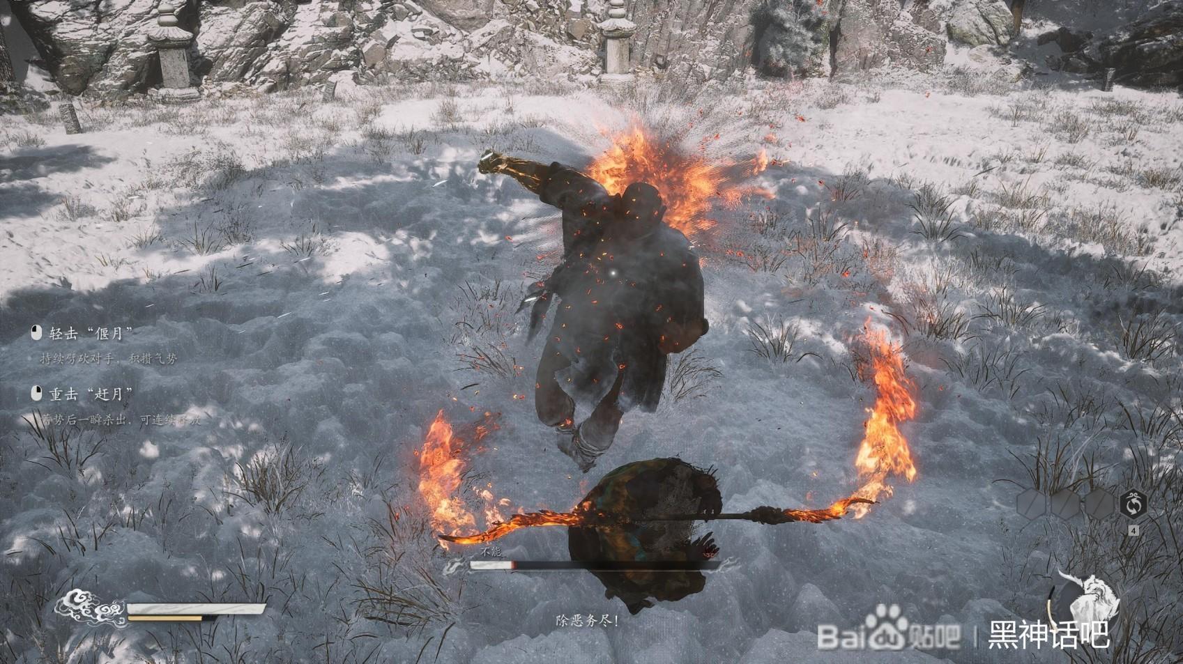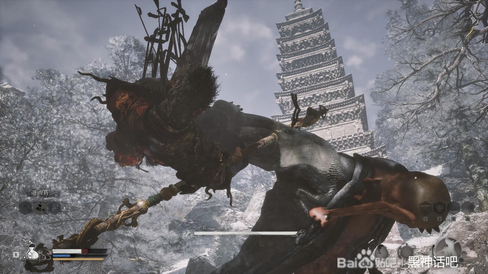 首先,我们直接就是跟不能拉开距离,开始疾跑,蓄力住我们的棍势,直到三豆的时候,在不能的面前甩出去,打出硬直,这时候我们躲开不能的脚踢和扫堂腿。然后后退回复我们的体力。