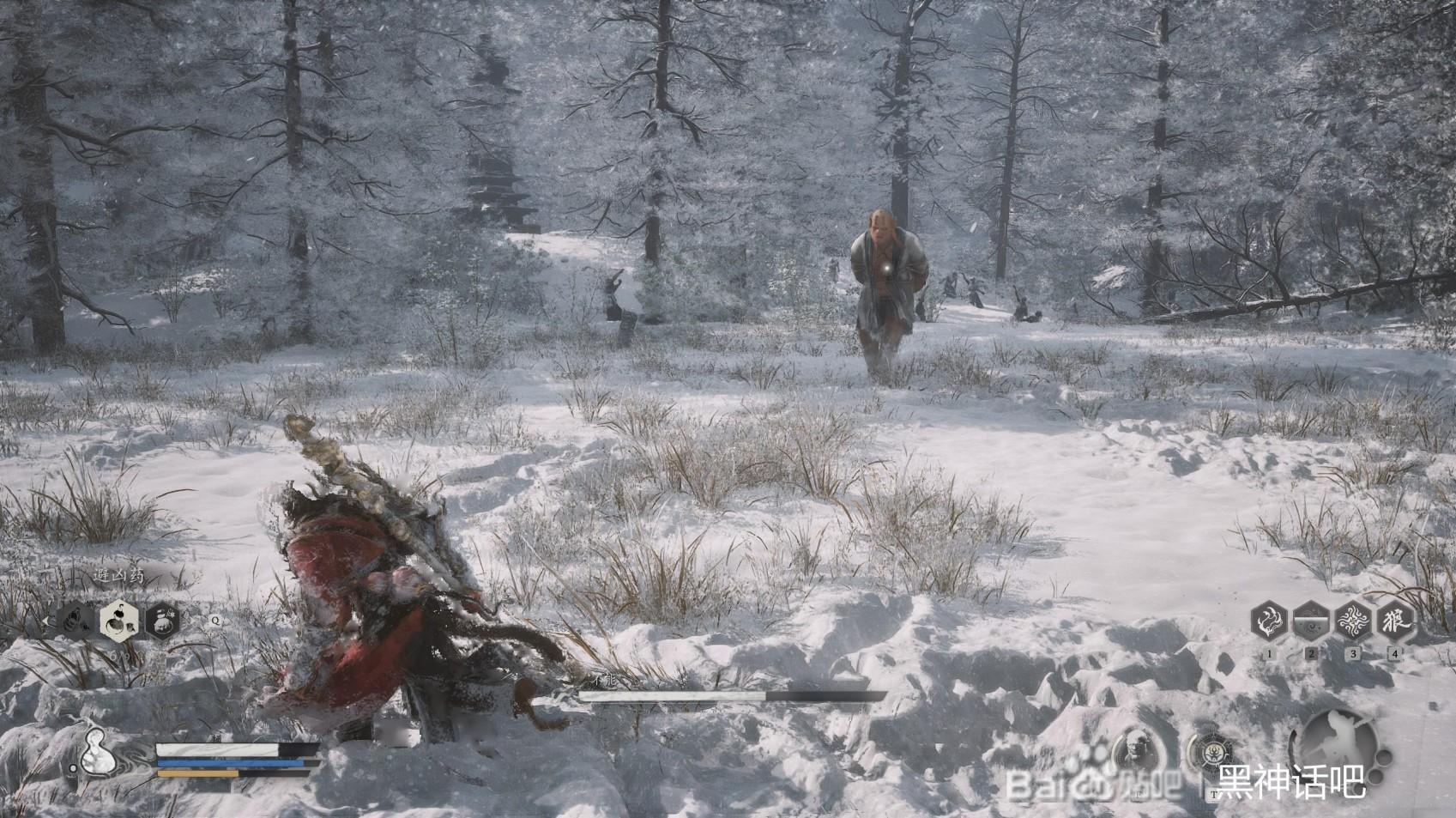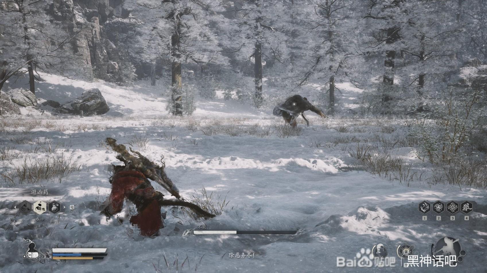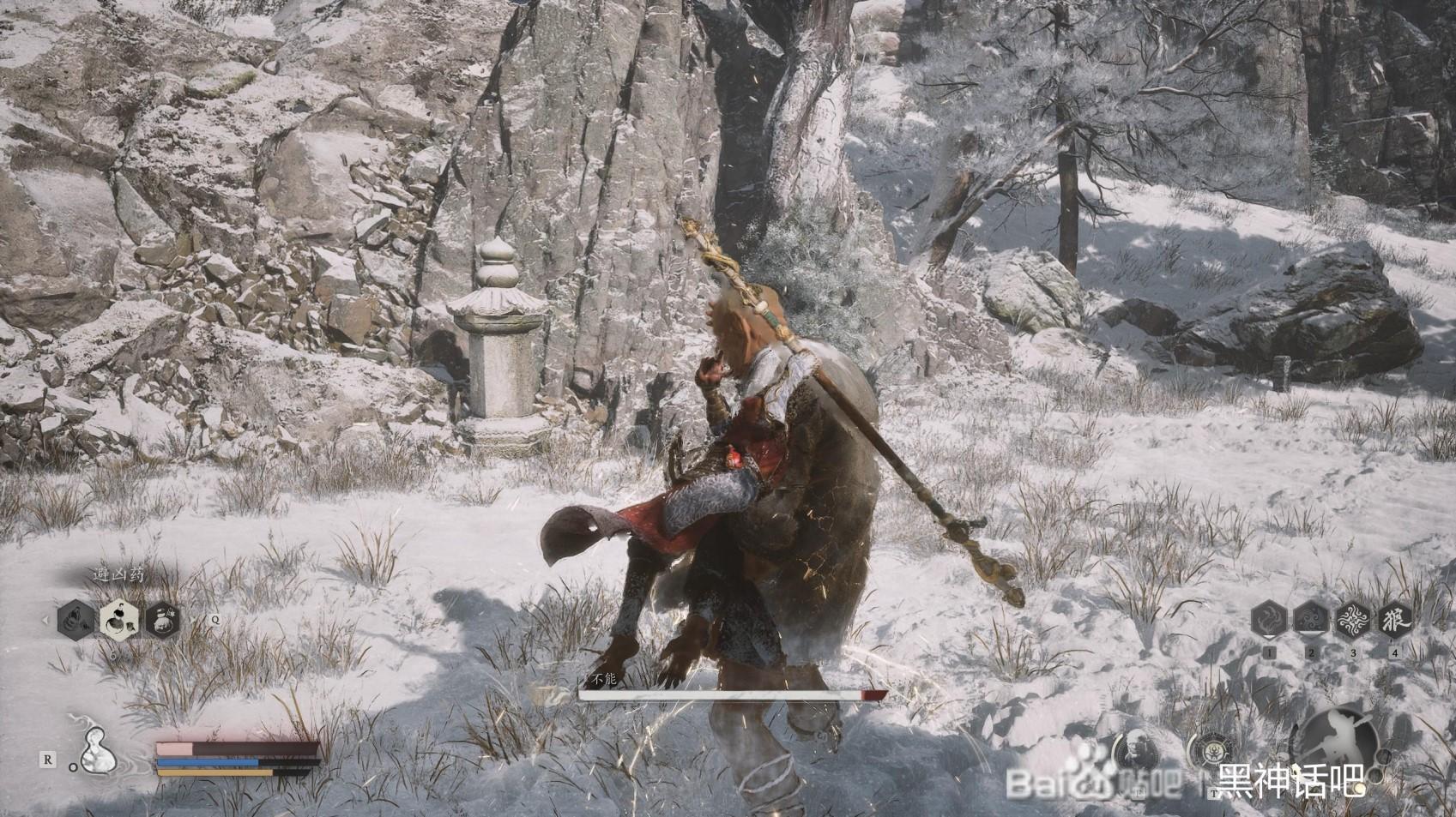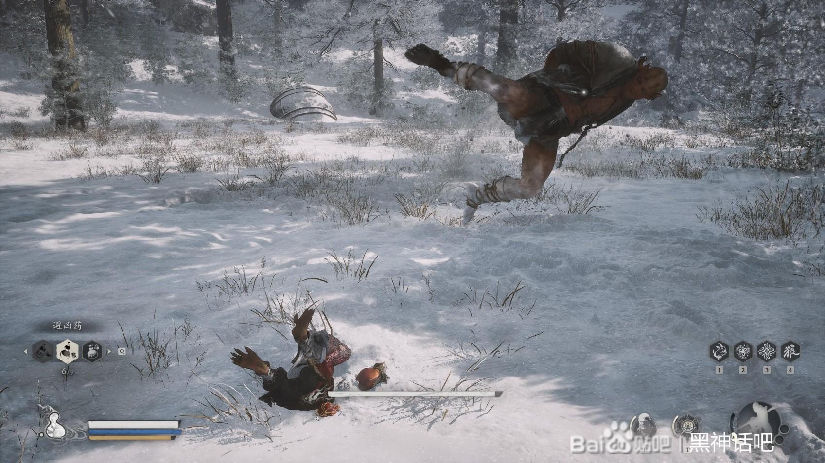 首先,我们直接就是跟不能拉开距离,开始疾跑,蓄力住我们的棍势,直到三豆的时候,在不能的面前甩出去,打出硬直,这时候我们躲开不能的脚踢和扫堂腿。然后后退回复我们的体力。