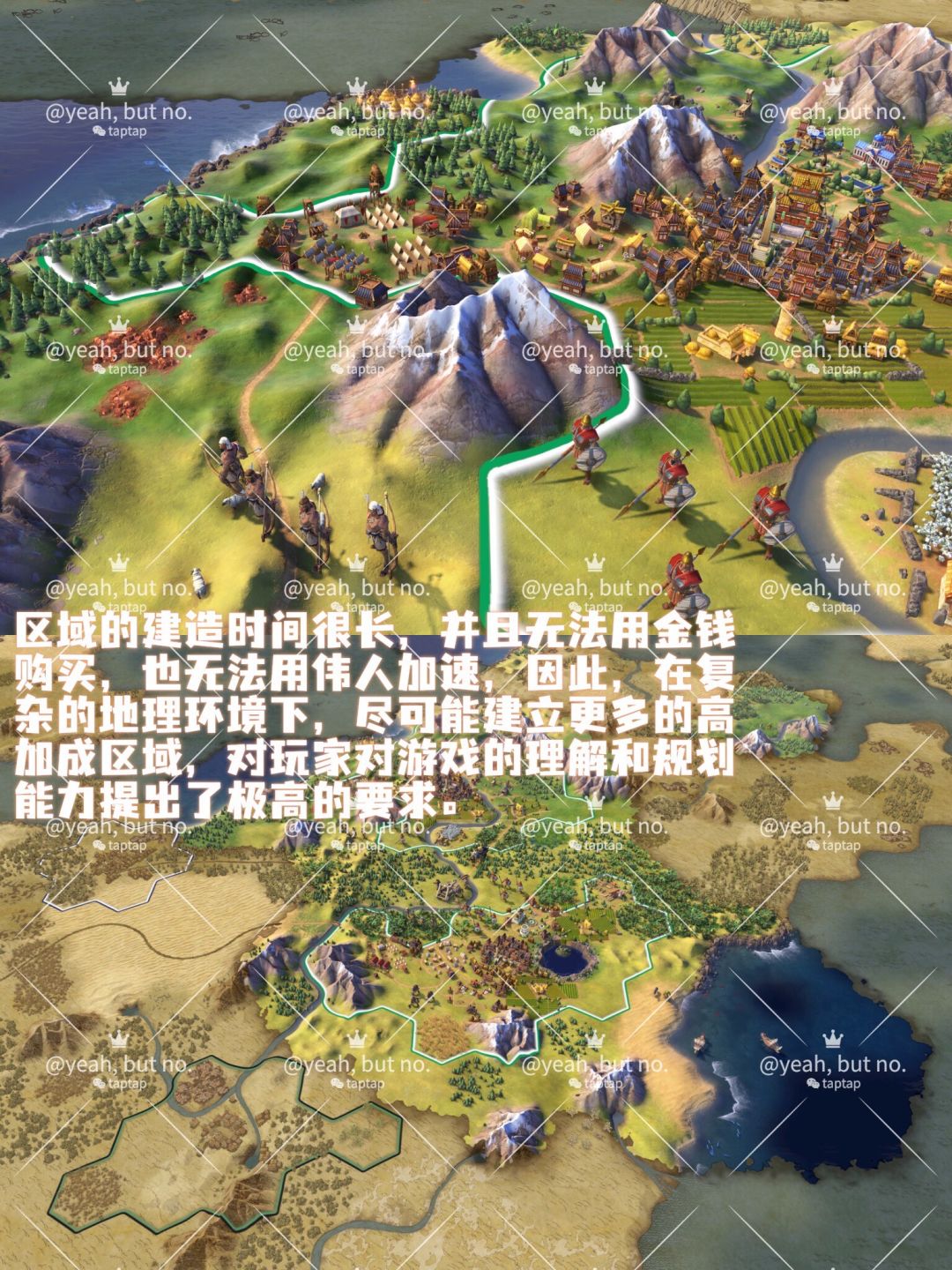 此外,区域的建造时间很长,无法金钱购买,也无法伟人加速。如何在复杂的地形环境下建立尽可能多的高加成区域,对玩家的游戏理解和规划能力提出极高的要求。