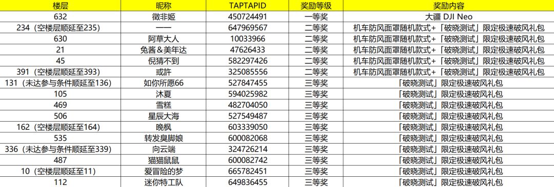 恭喜以下玩家在本次抽奖活动中获奖,请注意查看TAPTAP APP—消息中心中的相关信息哦!