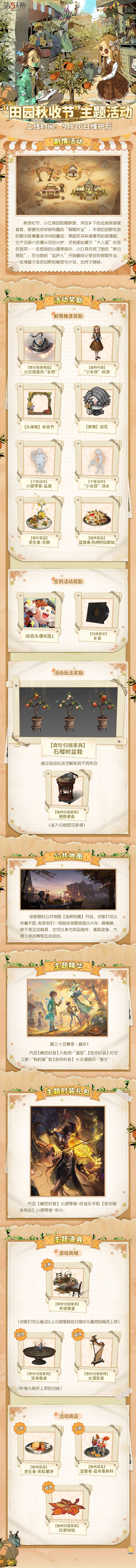 “田园秋收节”主题活动将于9月26日维护后正式开启!访客们参与活动,完成指定任务,即可获得【奇珍随身物品】火灾调查员-“全熟”、【独特时装】“小女孩”-秋游、【奇珍归宿家具】石榴树盆栽、【独特归宿家具】便携餐盘、头像框、头像、表情、个性动作、归宿音乐、菜品等奖励~ 同时,全新限时公共地图【金秋拾趣】开启,访客们可以伴着夕阳,和亲友们一同前往地图体验小火车、滑滑梯、秋千等互动载具,也可以参与菜品制作、道具变身、大胃王挑战赛等互动活动。 主题精华、主题时装礼包和主题道具也将同步上线!一起探寻埋藏于金色田野的秘密吧~