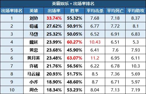 统计维度:出场率、胜率、平均击杀