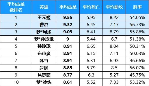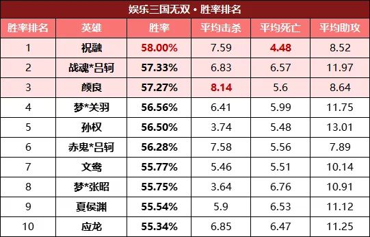 紧随其后的是首次上榜的战魂*吕轲和经历过小优化的颜良,而颜良也喜提胜率前十英雄中的平均击杀第一!