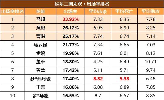 梦梦评价:为了西凉!本赛季马超以33.92%出场率的碾压之态强势登顶榜首!曹洪在经历削弱后出场率也有所降温,但仍旧能排在前三高位!