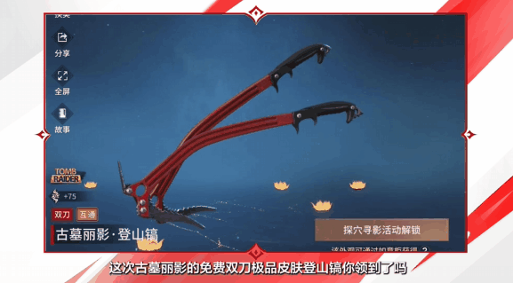 这次古墓丽影的免费双刀极品皮肤【古墓丽影·登山镐】你领到了吗?赶快上线参与活动领取吧!