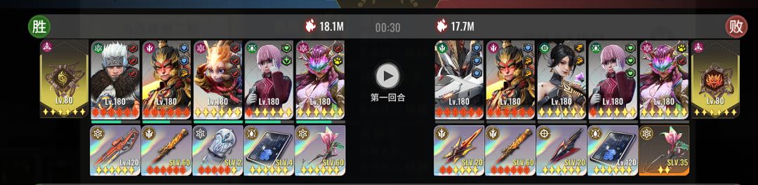 进攻思路:不上阵护盾角色,不给海蒂有输出的机会,优先击杀阵眼吕布防止被聚,所以我方前排雷德站位与对面吕布站位一致确保开局增益期间直接秒杀掉,大圣绕后限制后排发挥,将吕布打掉后这阵已破不会对我方造成任何威胁,桃子机关枪收割即可