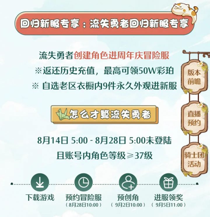 这次是新服是把回归服和冒险服合二为一了,在老服有过充值,并在一定时间内没有登录的账号可以在这次的新服继承9件老服拥有的时装、历史充值等额的彩珀(60-500000彩珀不等)。这个对于白嫖/月卡萌新来说其实没啥影响,受到影响的主要还是准备在新服大展宏图的氪佬。