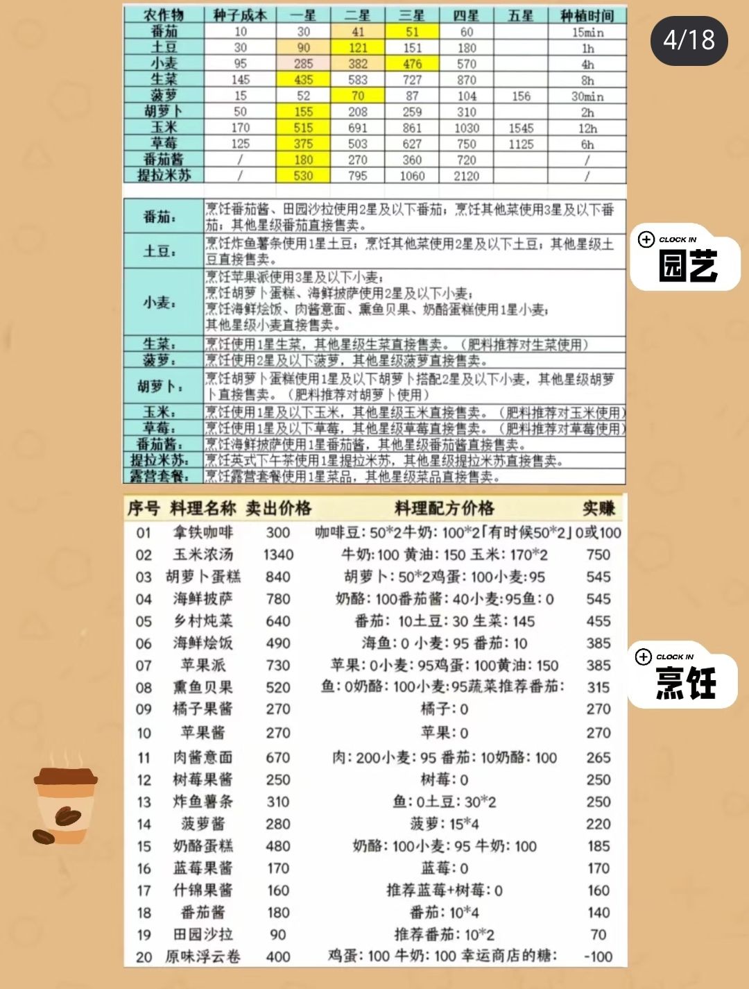 7.烹饪:三个方向摆三个锅同时开火效率最高,初始做果酱最赚钱(单果果酱>什锦果酱),升级后可以买咖啡配方,每天必买空50个牛奶和咖啡豆做拿铁赚钱