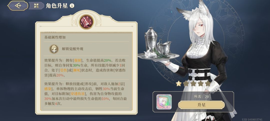 这是奇亚的个性介绍图,五星和一星,可以看到高星奇亚虽然有技能冷却效果,但是要击败敌人才行,这个在和Boss决战的关卡就没啥作用了。至于后面的感染效果+伤害效果都属于是附加的,并不能改善奇亚的使用。