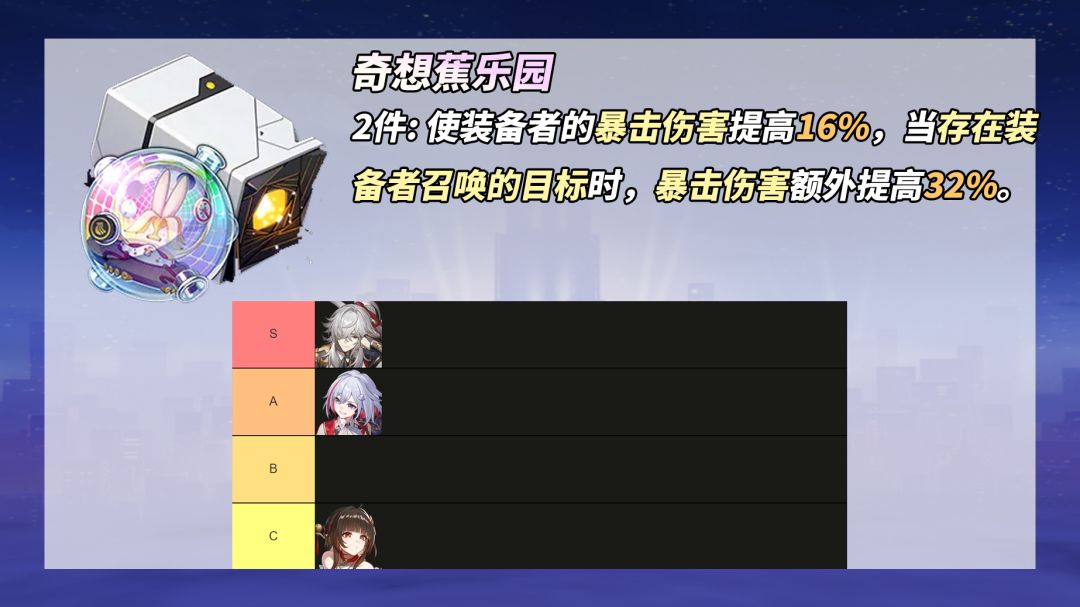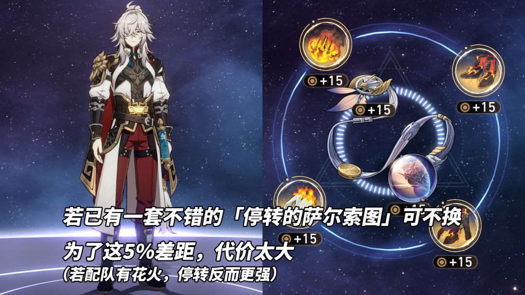 【景元玩家】略强于「停转的萨尔索图」,但提升率不到5%,且纯粹的48%暴击伤害很难配平双暴词条,若现已持有一套不错的萨尔索图还请忽略。