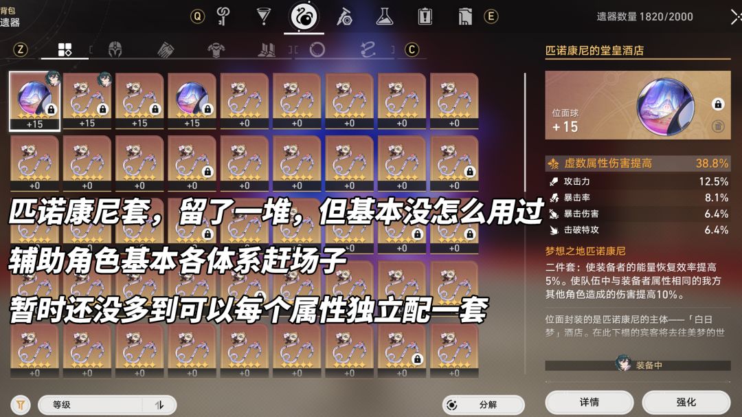 「梦想之地匹诺康尼」则基本不考虑,好用的辅助角色各队都在抢,基本不会选择这种固定属性配队、增益一般的配装。