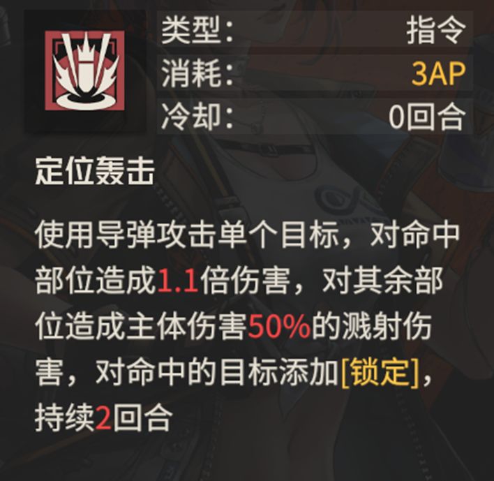 集火轰击:长期以来呼声很高的瞄准导弹终于是实装了,虽然是由技能来实现。实际上体验下来,并没有特别好用,主要是因为ap消耗太高,5ap的消耗,伤害倍率却只有1.4。除了瞄准之外,在锁定的情况下,还会对目标发起全体协力 ,需要友军能够攻击到目标才能生效