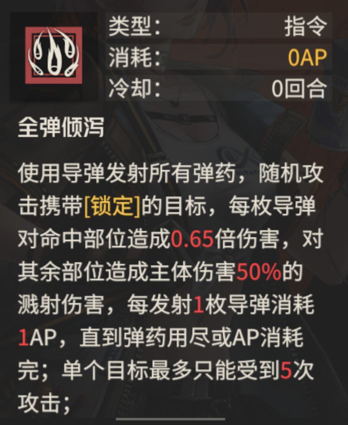 全弹倾泻:核心技能,依照1ap1弹药的规则,使用全部弹药尽可能对所有被锁定的目标进行攻击,此技能上限极高,言语难以表达,简单来说,在仅锁定一个目标,攻击不被分摊的情况下,5发导弹全部命中一个目标的一个部位,伤害倍率会来到惊人的0.65*5=3.25倍。