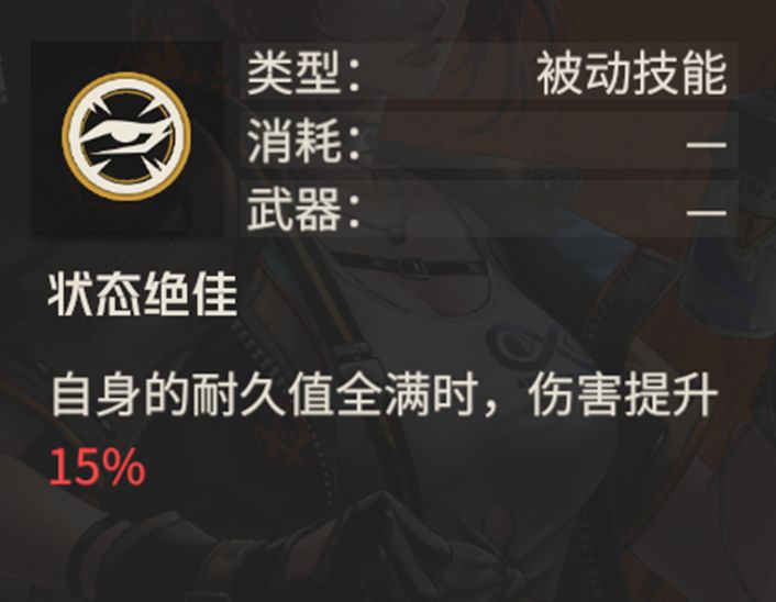 状态绝佳:被动增伤技能,条件为自身耐久全满,对于处于安全位置输出战术家来说不难触发
