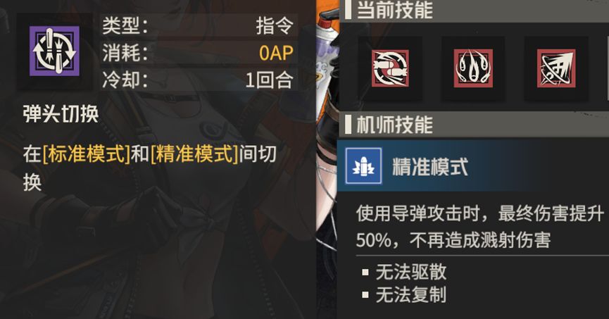 弹头切换:顾名思义,以两种不同的模式使用导弹进行攻击,标准模式就是常规的导弹攻击,精准模式即是让导弹只攻击一个部位,这种情况下,最终伤害能够提升50%。此技能适用于处理“人棍”敌人,导弹的伤害组成中溅射伤害占据较大部分,当敌人只剩下躯干时,导弹攻击便造成不了多少伤害,精准模式的单一部位高伤害特点则可以有效应对此种情况