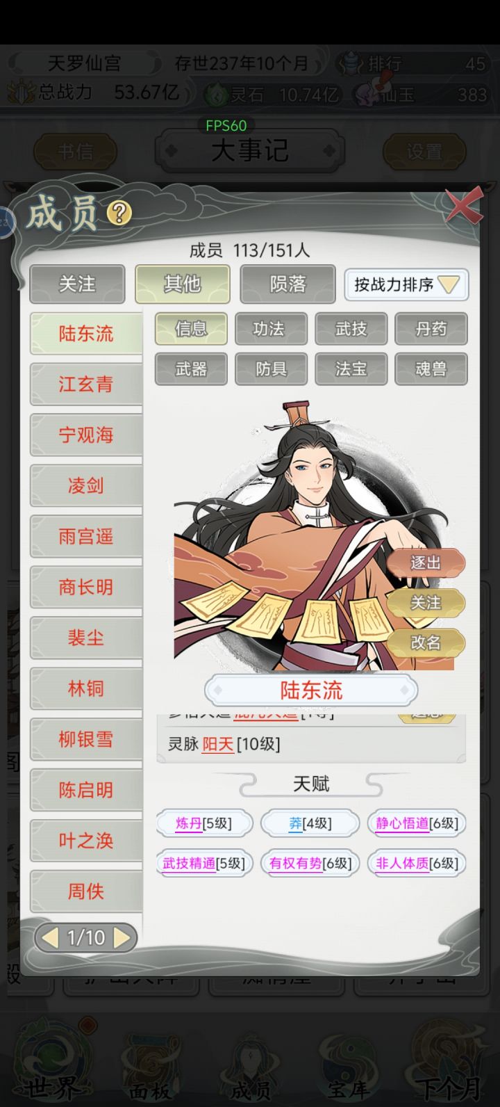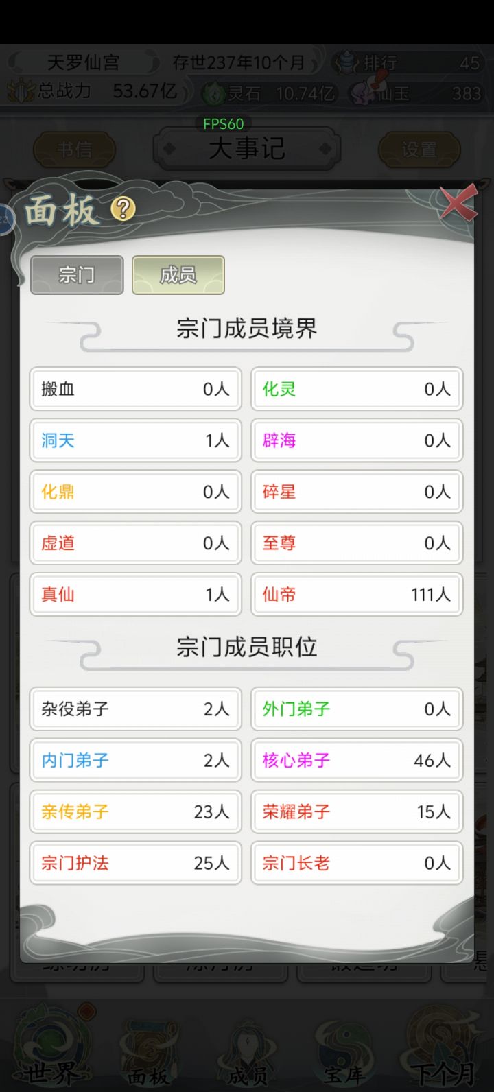 首先前期游戏刚开始尽量选那些战力词条的角色能附带灵石生产加成更好,然后游戏到了中期灵石会疯狂增加,当你看到你的收入跟支出马上快成为正比的时候,一定要招收一些带灵石生产的弟子,然后就是刷各种任务这边推荐除魔卫道,然后等到后面养出了一尊大帝,中期一定要好好发育能做的任务全做,把能拿的武功秘籍全拿了,后期就狂点下一个月就行了大帝遍地走哈哈