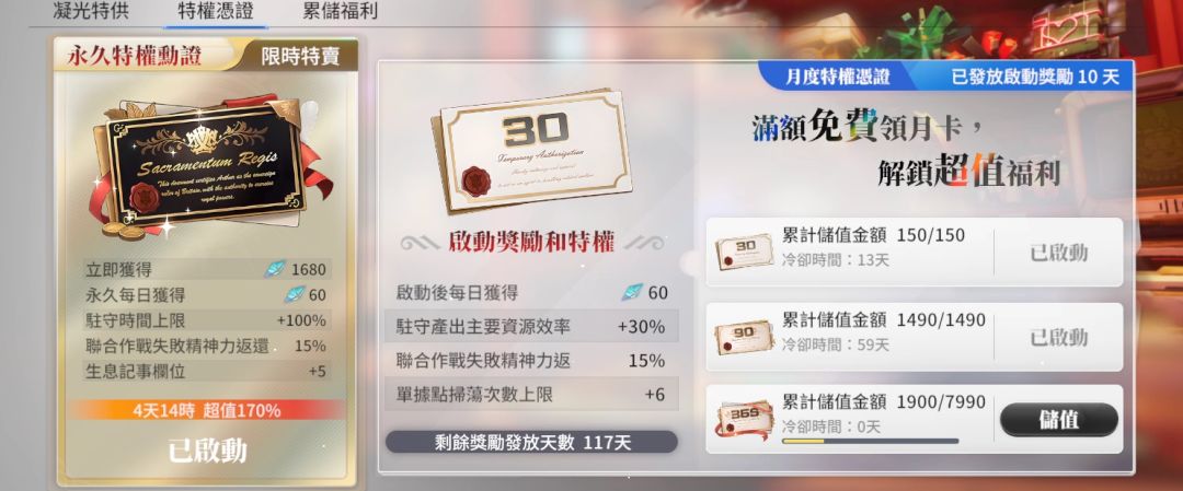 氪金相关,(图片内金额为台币,大概除以4.5即可)永久卡大概110到120左右,因为目前有返月卡的活动,买永久卡肯定是能领到第一张月卡的,还算是可以吧。