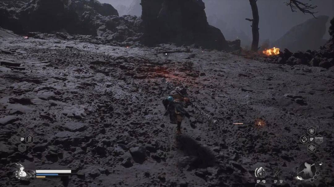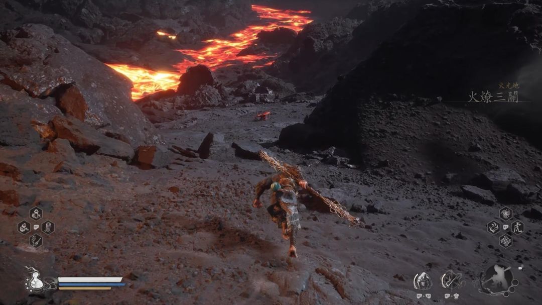 到一个拿着盾牌的怪后,从左边的悬崖跳下,燧统领就在深处,注意这里地面全是岩浆,推荐法宝可以换上避火罩,被烧伤还可以回血,打完燧统领之后,如果前面的隐藏BOSS都打了,应该可以集齐3块业火晶,制作蓄力劈棍的最强武器业火杖了。
