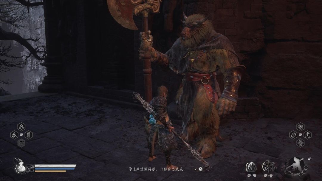 牛头支线刚进第五章时,可以在最一开始的地方遇到一个人物「皓斧力士」,击败后会开启前往隐藏地图的支线任务,任务需要打倒5台五行战车,其中有一台是已经自己损毁不用打,另一台则需要先打完其他三台后才会出现,所以我们只需要击败3台,而这3台随着主线推进,就都会打到,不用特别去找,只需要注意在击败第二台后,可以先回火燎一关找「皓斧力士」对话,传送到灰烬林的春秋寨,不要过桥,往土地庙的对面走,下到最下层。