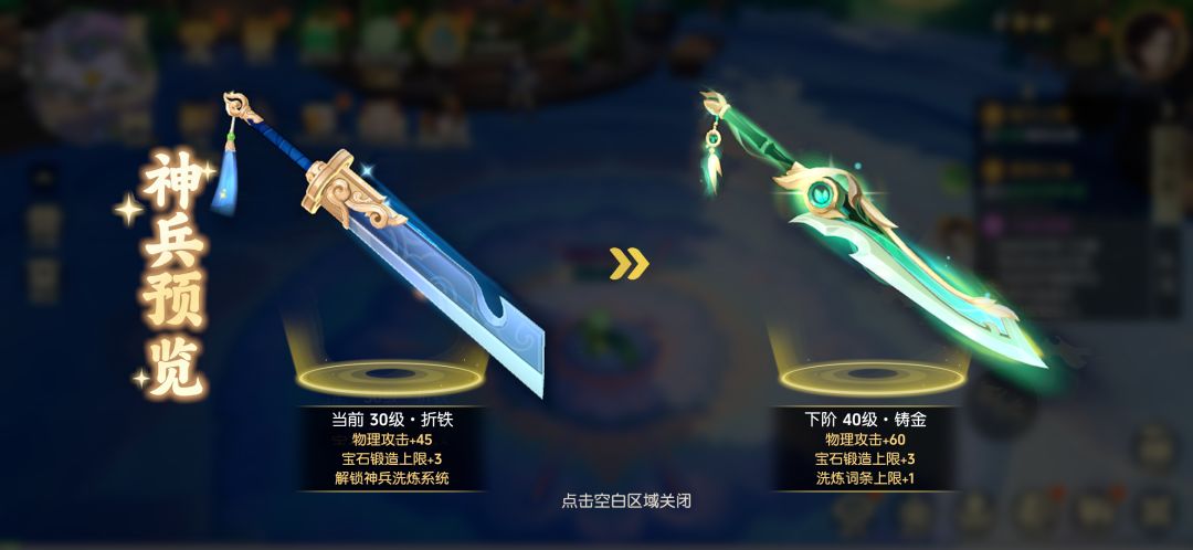 神兵洗炼也将开放40级洗炼,基础属性和词条数量都会更多。