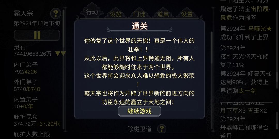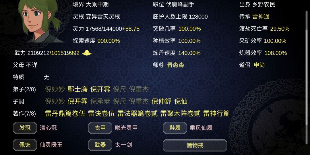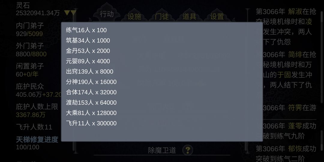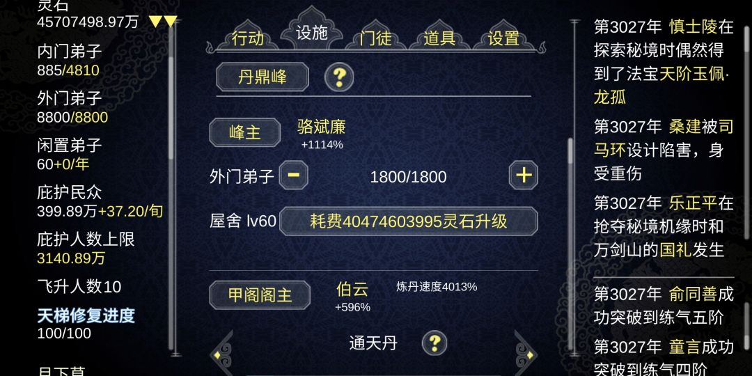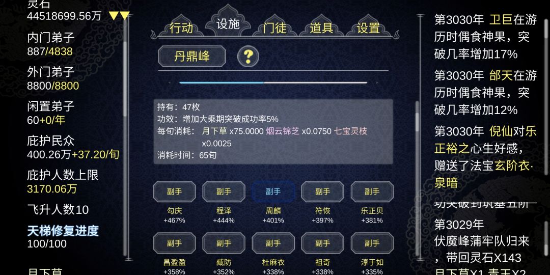 通关方式:首先楼主是嗑药流通关,嗑到什么程度了呢,这么说吧,通天丹的话只要60荀就能做出一个(3.4个阁同时开工,基本60荀可以出3.4个通天丹),所以,在我的门派是不存在高阶突破失败这种情况的,hhh🌞