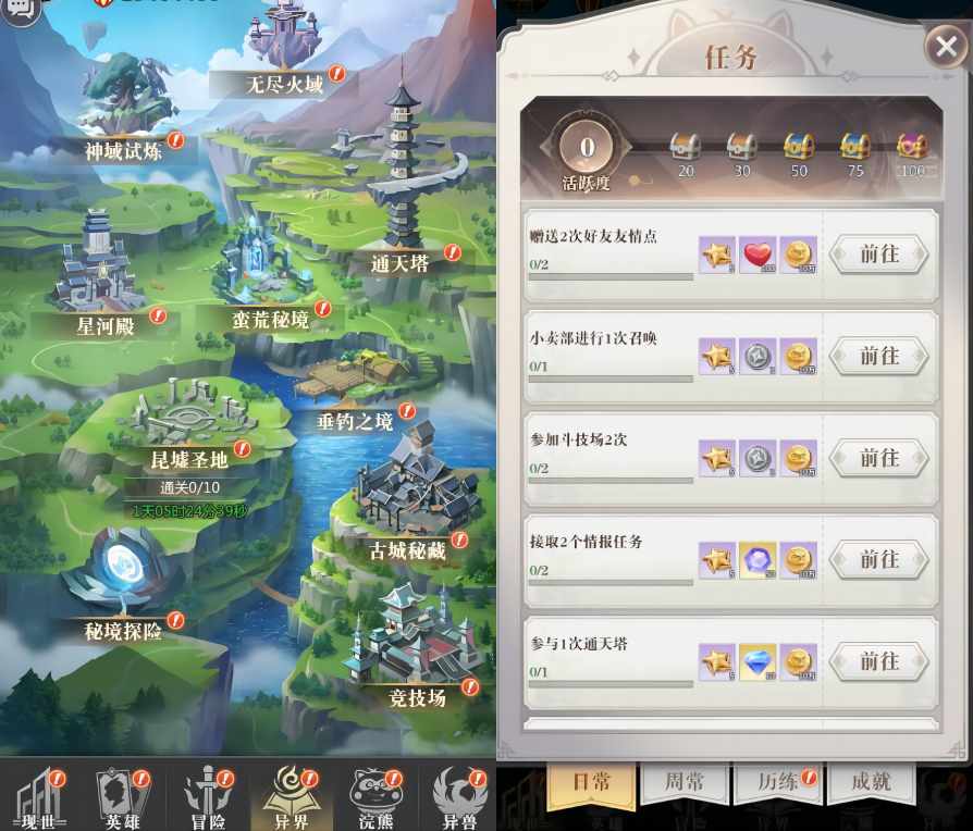 日常活动直接按照任务前往完成。优先购买50钻石的次数,100以上不推荐,钻石多的可以拉满。冒险的快速作战买完专属订阅,直接拉满。
