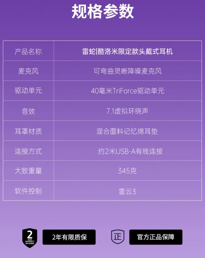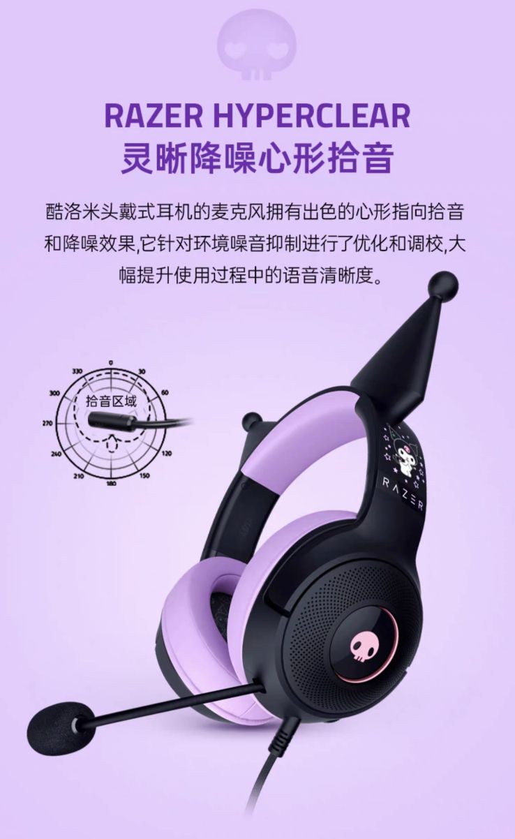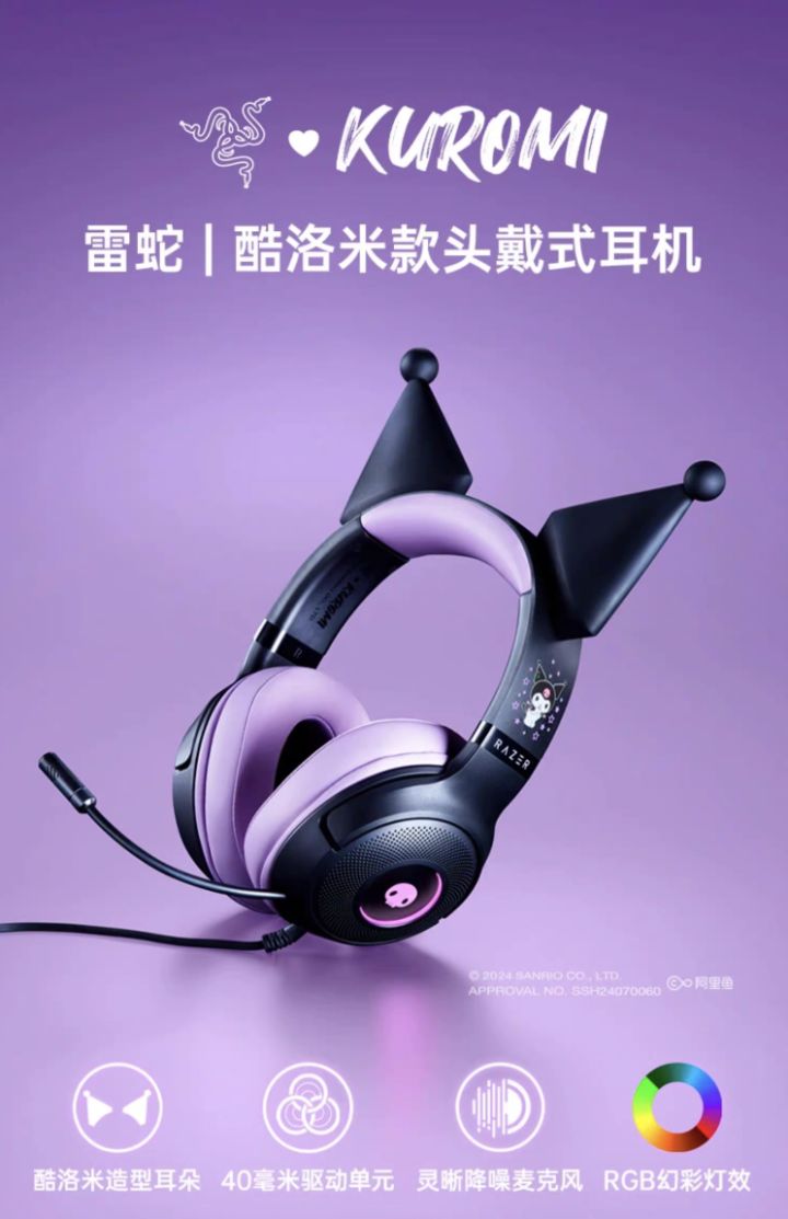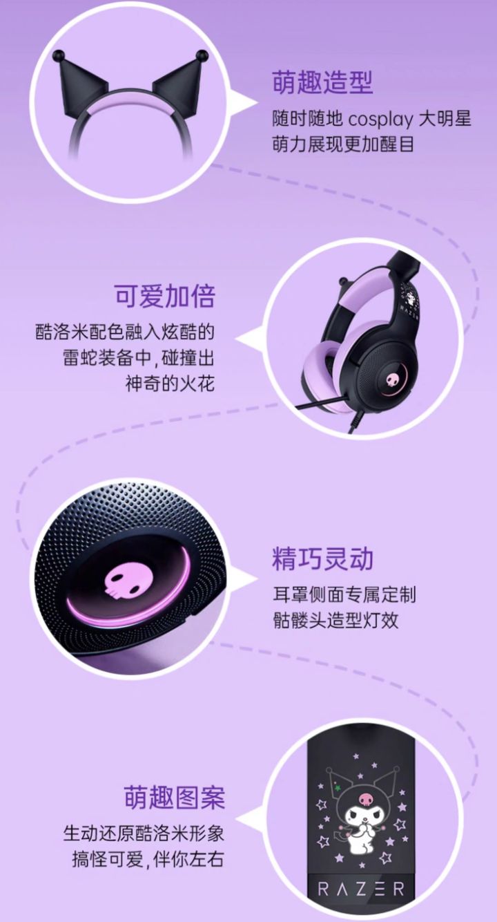 据介绍,这款耳机整体采用紫黑配色,拥有库洛米耳朵造型,耳机耳罩侧面拥有骷髅头造型灯效,头梁印有库洛米图标。