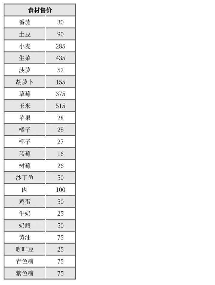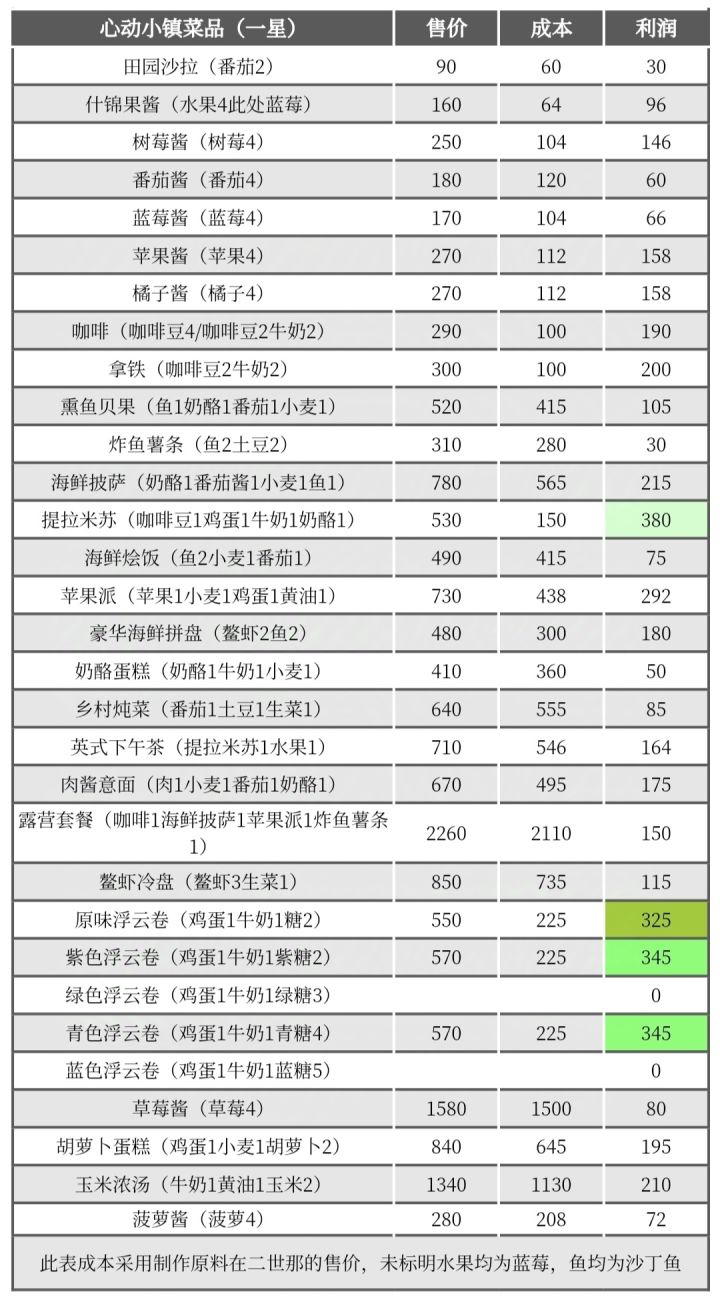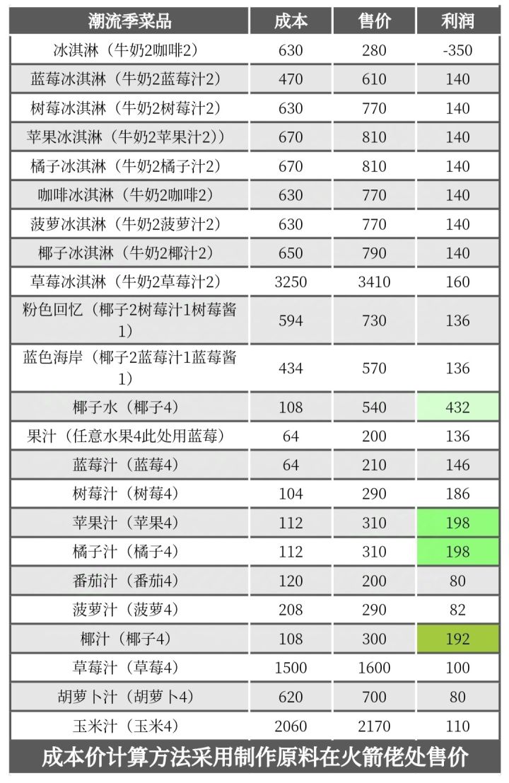 成本价计算采用制作原料在二世处售价。牛奶等需在厨师处购买物品采用二世售价,非原价(太折腾了,不想挨个对