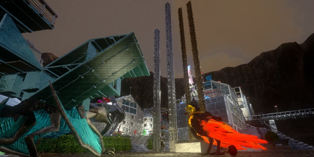 它到底好处在哪呢? 看看这些图你大概就明白了,我这举了3个例子,聚合物地基能让你建在上面的任何材料(茅草 木质 石质 铁质 泰克) 都达到游戏里26这个单位的建造高度,也就是14块板,或者15根柱子。(这是目前官方从地面起能建出的最高高度了,以前老版本的浮空建筑bug就不去考虑,现在已经不行了)