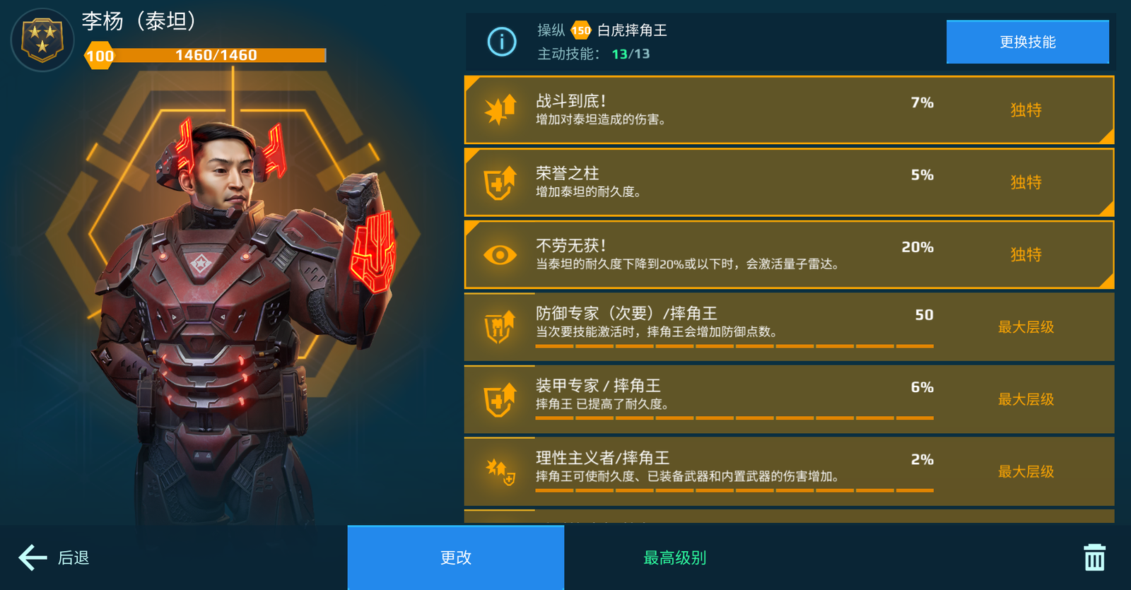 其他可选择的机师技能中,[装甲专家]、[重型战斗者]能够提高白虎摔角王耐久度;[装甲专家]、[泰坦天敌]能够强化泰坦的内战能力,指挥官们可按照自己的风格进行培养。