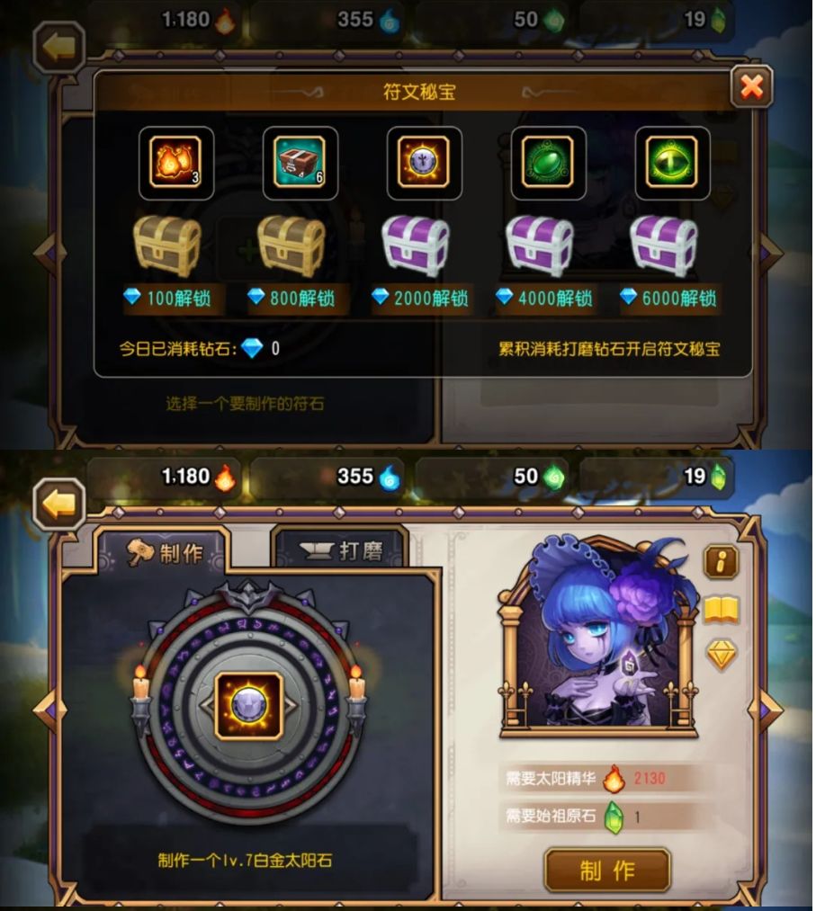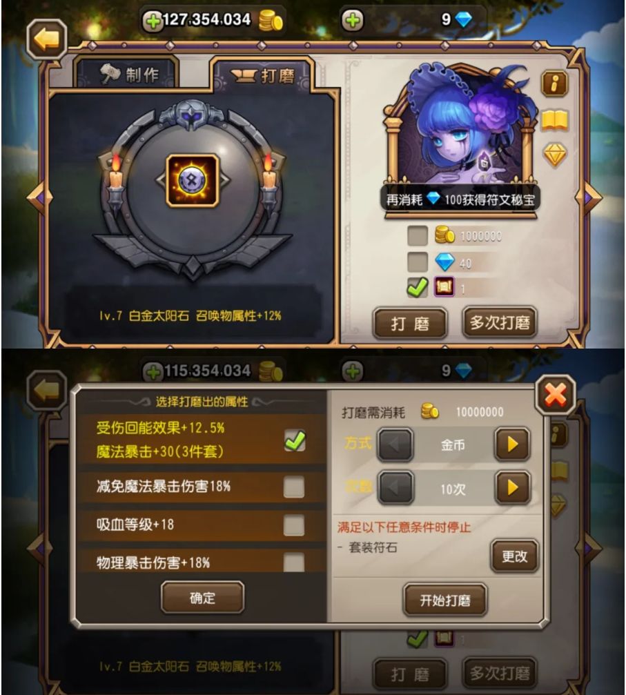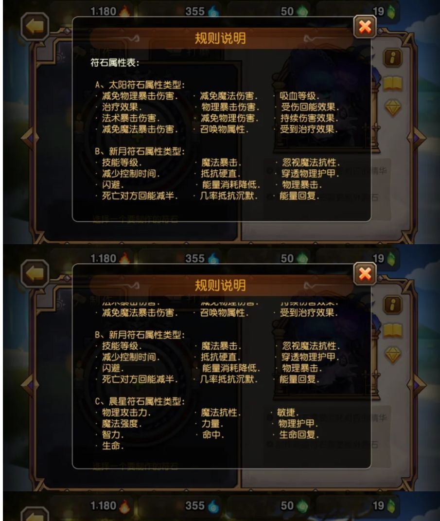 最后一个就是“符石加工”了,规则看着比较复杂,老黄这里长话短说。需要消耗资源先进行符石打造,打造出符石之后再对符石进行“打磨”,即洗属性,洗出需要的属性再进行保存,也可以算做洗练的一种。