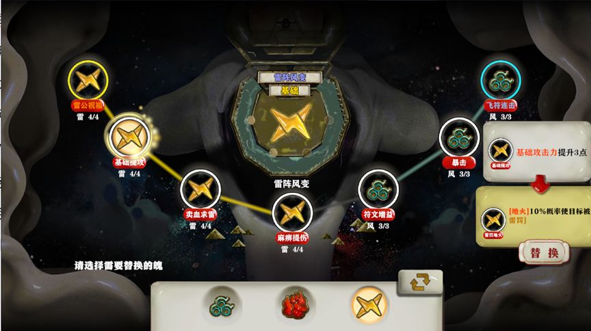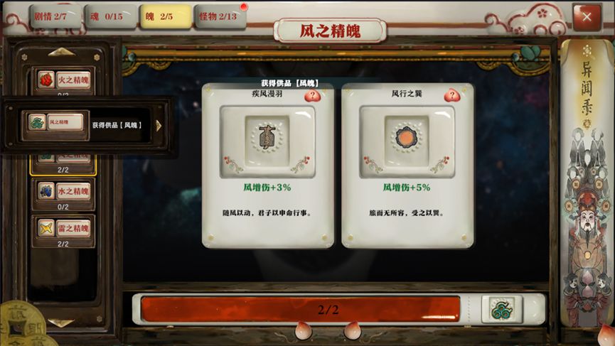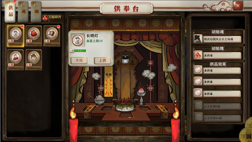 供品系统是游戏中的另一大特色,通过收集和搭配供品,玩家可以在局外进一步提升角色的战斗能力。