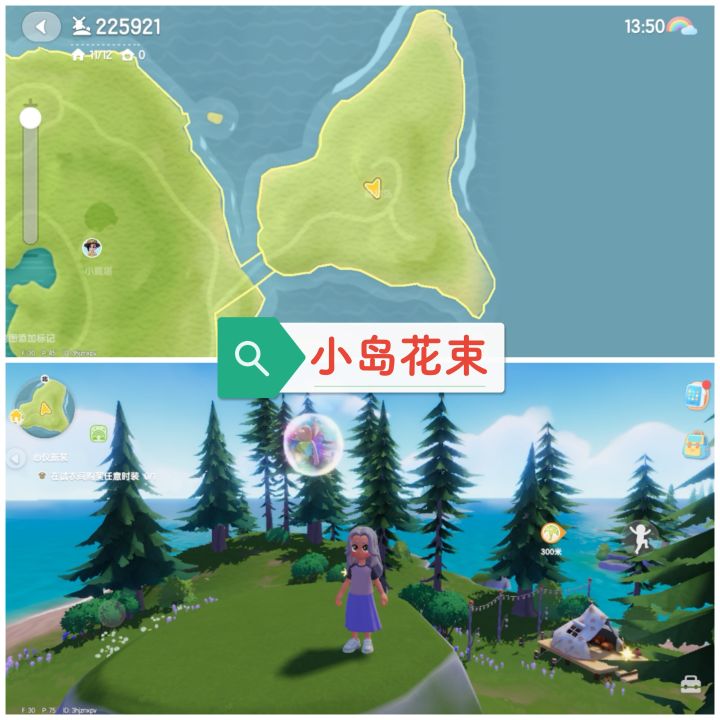三朵花束位置:家园门口、森林岛中心石头上、森林湖下游!