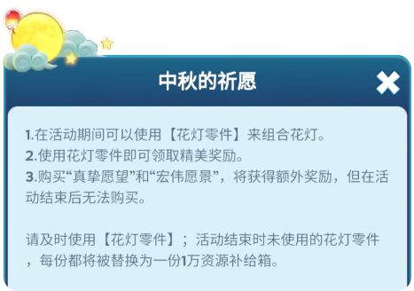 哪怕是小小零件也寄托着希望,可在“中秋的祈愿”活动中组合成花灯。(活动结束后系统将回收该道具)。