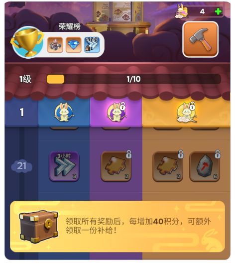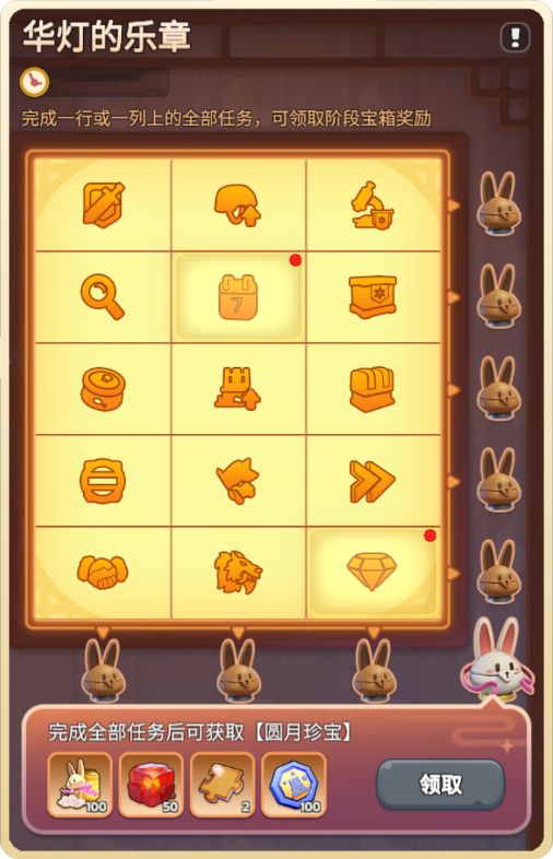 2.完成一行(横向)或一列(纵向)上的全部任务,可解锁阶段宝箱。