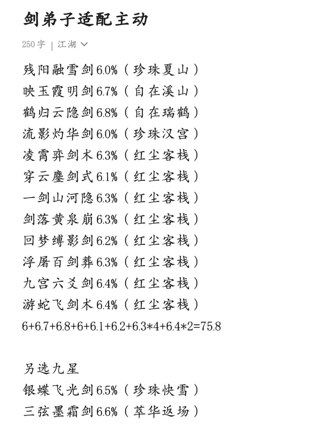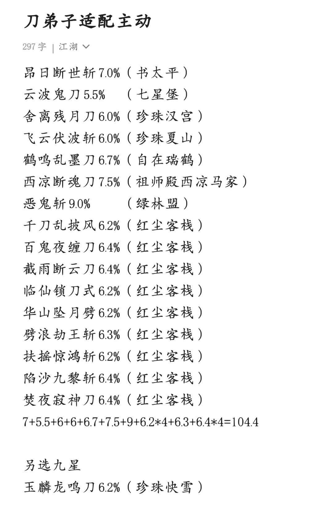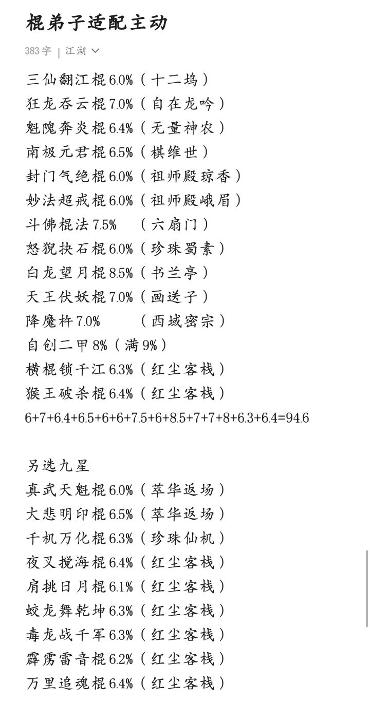 12.17日更新:神龙摆尾无法触发跗骨已修复,加入腿弟子技能组,自创概率拉较高可丢弃一个主动,天舞尽量不丢组成14主动技能组,如自创概率不足100%可多学一个50%熟练度的破防武学补上