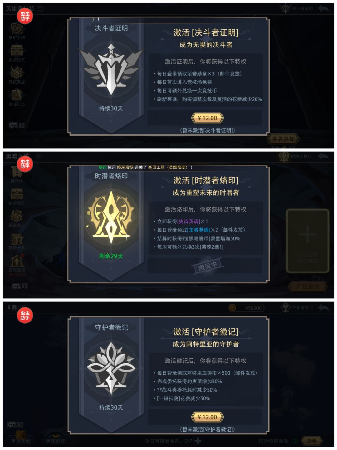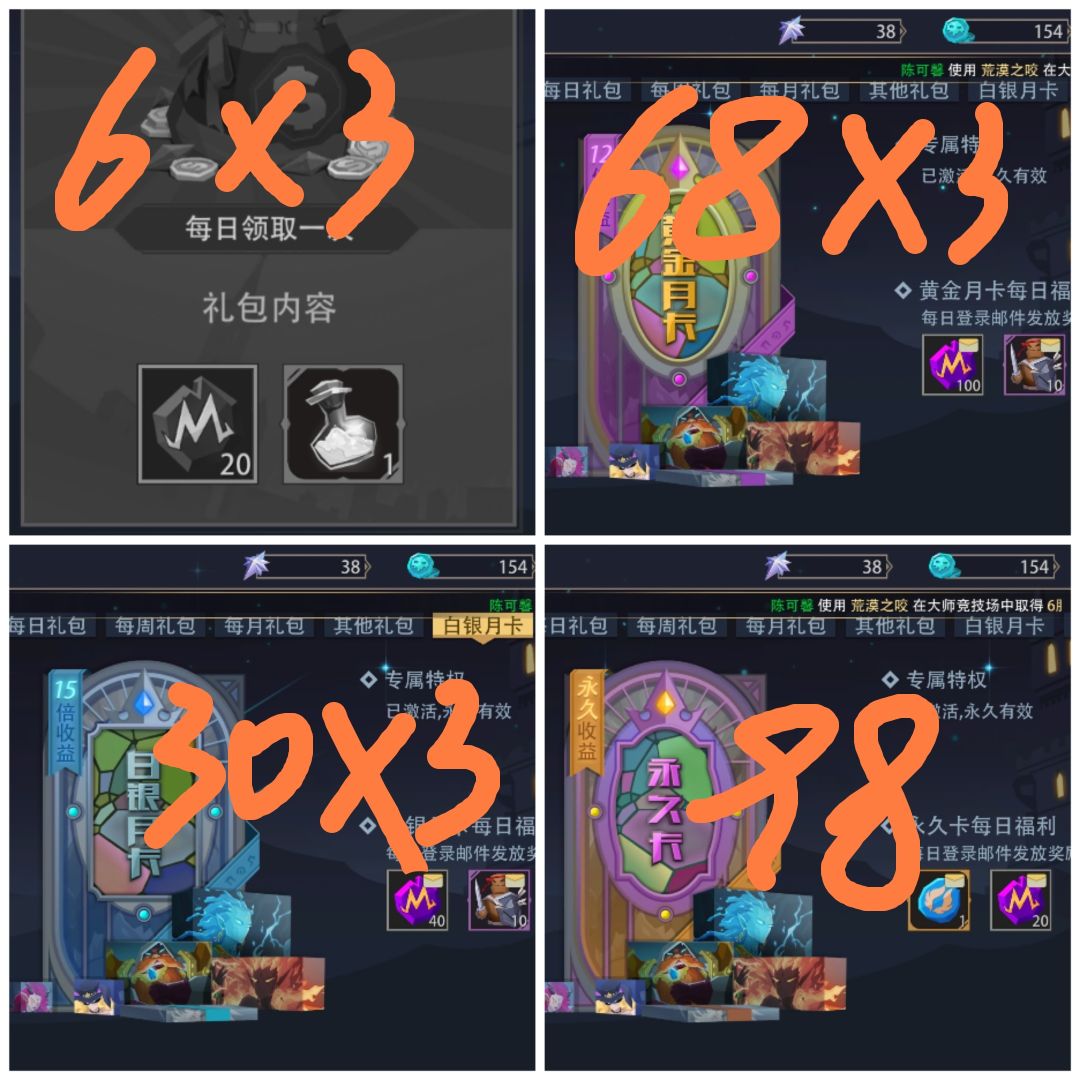 包含,竞技场,世界和黑塔的月卡,每个12元,持续一个月,根据需求。其中黑塔月卡性价比最高;其次世界月卡推荐前期需要开世界的玩家氪