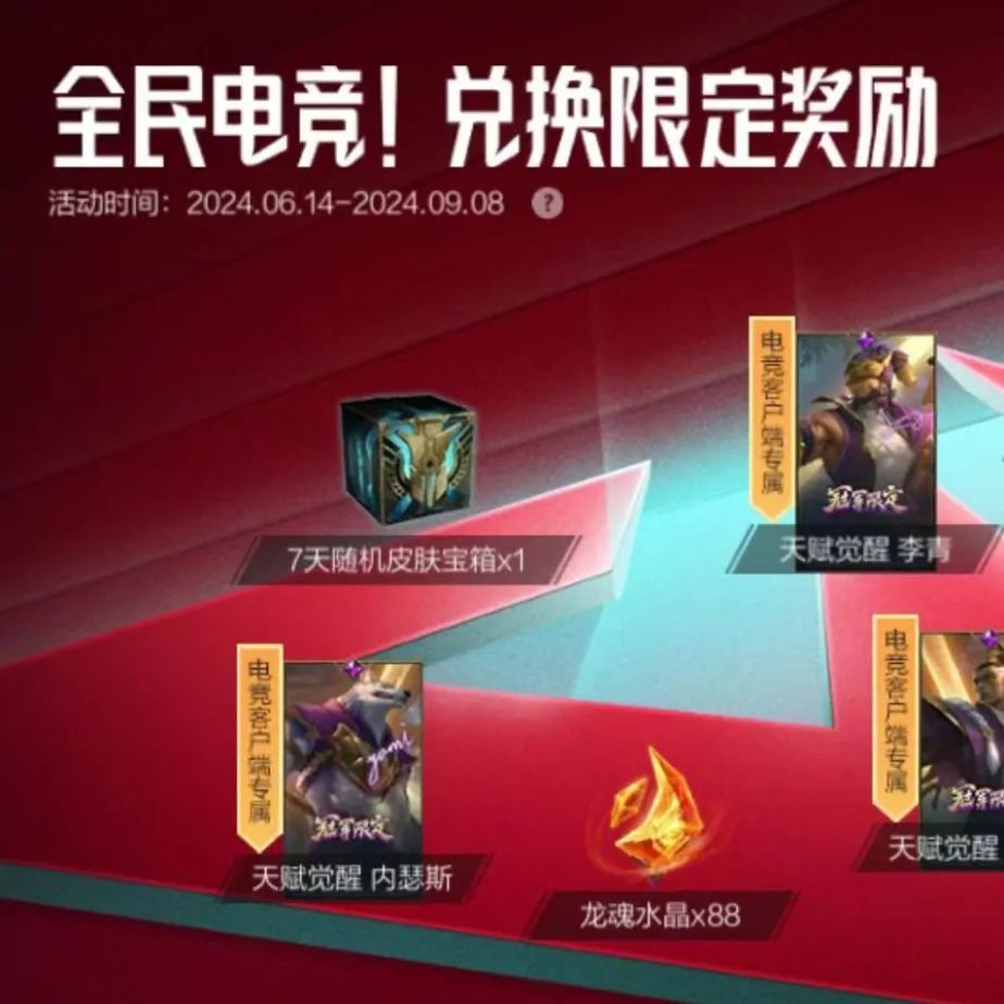 兑换电竞专属好礼仅剩最后一天!召唤师记得将积攒的积分,抽取天赋觉醒系列皮肤、玉剑传说 苍鸾 莫甘娜、神龙守卫 加里奥等丰厚奖励。