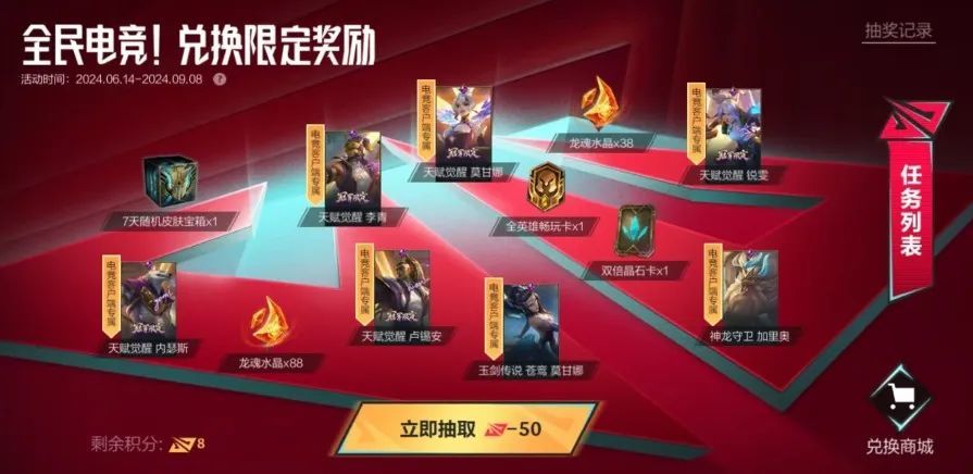 奖励:天赋觉醒系列皮肤,玉剑传说 苍鸾 莫甘娜,神龙守卫 加里奥,全英雄畅玩卡,7天随机皮肤宝箱,双倍晶石卡,龙魂水晶*88